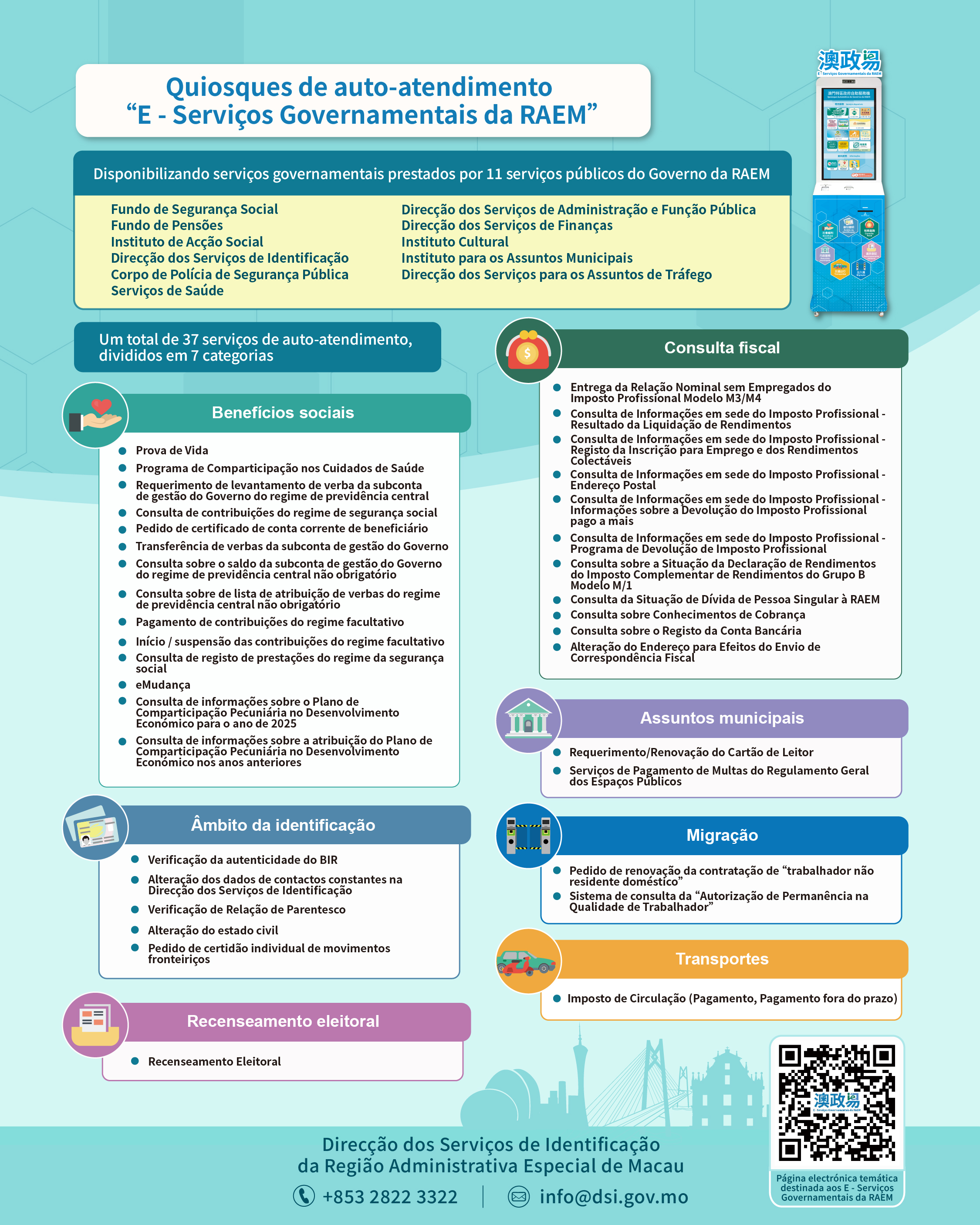 Os quiosques de auto-atendimento “E - Serviços Governamentais da RAEM” disponibilizam um total de 37 serviços governamentais que são mais procurados pelos residentes de Macau, prestados por 11 entidades públicas, em sete categorias, nomeadamente nas áreas de benefícios sociais, identificação, consulta fiscal, assuntos municipais, recenseamento eleitoral, transportes e migração, a fim de facilitar a vida dos residentes de Macau que trabalham e vivem na Zona de Cooperação Aprofundada, permitindo-lhes tratar dos serviços necessários sem terem de regressar a Macau, contribuindo assim para a criação de um ambiente habitável semelhante entre Macau e Hengqin. Os “E - Serviços Governamentais da RAEM” serão instalados no lado norte do átrio de chegadas do segundo andar do Posto Fronteiriço Hengqin, bem como no Centro de Serviços para Empresas e Quadros Qualificados da Zona de Cooperação Aprofundada entre Guangdong e Macau em Hengqin (endereço: Edifício n.º 22 do Vale de Criação de Negócios para os Jovens de Macau em Hengqin, sito na Rua Huan Dao Tong Lu, n.º 1889, Zona de Cooperação Aprofundada entre Guangdong e Macau em Hengqin). Além disso, em Junho do corrente ano, os referidos quiosques de auto-atendimento já se encontram instalados em quatro cidades da Grande Baía: Cantão, Zhuhai, Zhongshan e Jiangmen. Para mais informações sobre os quiosques de auto-atendimento “E - Serviços Governamentais da RAEM”, consulte a página electrónica temática: https://www.dsi.gov.mo/mo-eservice/.