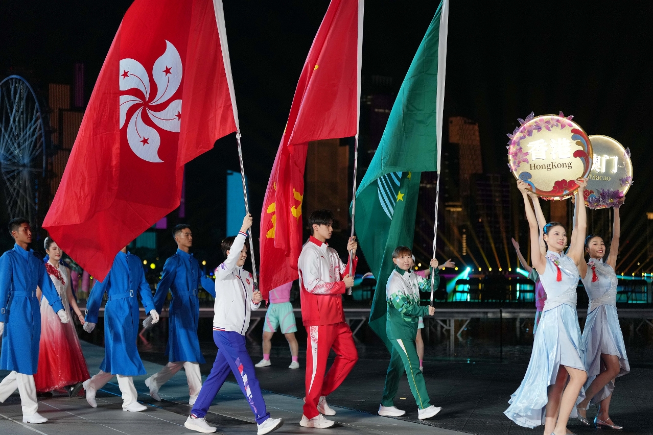 Seguiu-se a cerimónia de entrega da bandeira dos Jogos Nacionais, na qual os três Directores Executivos da Comissão Organizadora da 15.ª edição dos Jogos Nacionais, respectivamente, o Chefe do Executivo da RAEM, Sam Hou Fai, o Chefe do Executivo da RAEHK, John Lee Ka-chiu e o Chefe da província de Guangdong, Meng Fanli, entregaram em conjunto a bandeira ao Coordenador da Comissão Organizadora da 15.ª edição dos Jogos Nacionais e Director da Administração Geral do Desporto do Estado, Gao Zhidan, que a entregou a Mao Weiming, Chefe da província de Hunan, simbolizando o início oficial dos preparativos para os 16.os Jogos Nacionais, que se realizarão na província de Hunan em 2029.