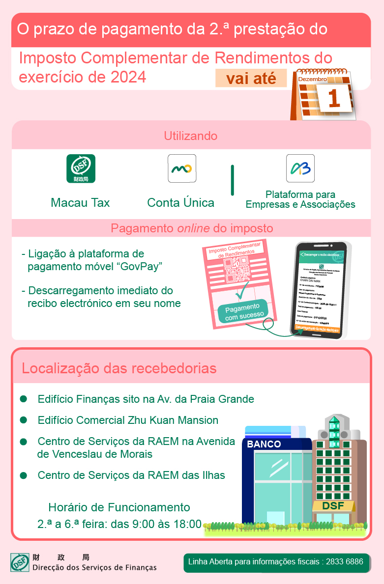A Direcção dos Serviços de Finanças vem lembrar os contribuintes do Imposto Complementar de Rendimentos, que o prazo de pagamento da 2.ª prestação do respectivo imposto referente ao mês de Novembro, termina no dia 1 de Dezembro. Para evitar a aplicação de multas e juros adicionais pelo pagamento fora do prazo, os contribuintes que ainda não efectuaram o pagamento do imposto acima mencionado devem fazê-lo com a maior brevidade possível.