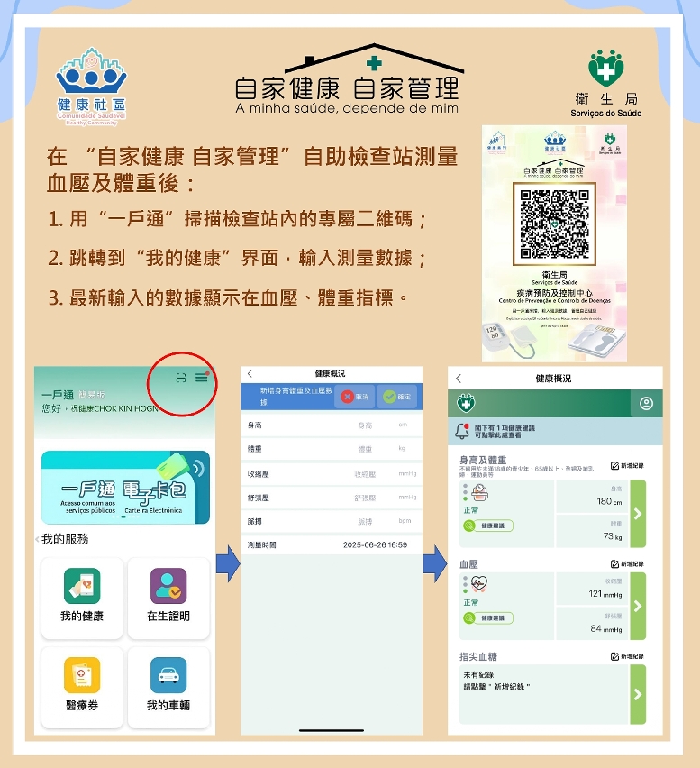 Para incentivar os residentes a monitorizarem, por sua iniciativa, o seu estado de saúde e facilitar a autoavaliação do peso e da pressão arterial, os Serviços de Saúde criaram, desde 2015, os postos de autoavaliação no âmbito do programa “A minha saúde, depende de mim”. E o número foi aumentado para 146 postos, distribuídos por diversos espaços públicos como instituições médicas, mercados, centros de comida, bibliotecas, centros de actividades, pavilhões desportivos, farmácias e bancos etc. Em 2024, o programa registou aproximadamente 1,6 milhões de utilizações, envolvendo cerca de 100 mil utilizadores, o que demonstra a eficácia do programa. Em 2026, o número de postos de autoavaliação será alargado para 200, abrangendo empresas saudáveis, escolas saudáveis, serviços públicos, entre outros, e serão instalados mais quiosques de autoavaliação integrados que combinam as funções de exame físico e avaliação psicológica. Será dada prioridade à instalação de centros de actividades comunitárias, centros de comida e centros de serviços públicos com funcionamento de 24 horas, reforçando a divulgação, elaborando mapas interactivos com a localização dos postos,  assim como vídeos sobre a utilização dos equipamentos, entre outros.