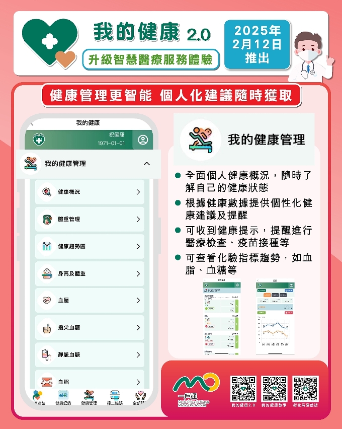 A nova versão da plataforma "A minha saúde", lançada em Fevereiro de 2025, promove o uso de ferramentas electrónicas de gestão de saúde pelos residentes, com três características principais: dados de saúde mais abrangentes, recomendações personalizadas de saúde e envio de lembretes. No que diz respeito aos dados de saúde, para além de índices como IMC, pressão arterial e glicemia, foram adicionados os dados sobre a gordura no sangue, o rastreio do cancro do colo do útero, o rastreio do cancro colorrectal e o histórico vacinal, podendo os residentes introduzir, por si próprios, o peso corporal. O sistema vai gerar um mapa de tendências para visualizar a evolução para monitorização do estado de saúde, enquanto a nova função de "gestão de peso" calcula automaticamente as necessidades calóricas diárias com base em parâmetros individuais (idade, altura, peso), após avaliação do nível de actividade física, fornecendo um menu de refeições saudáveis personalizadas e, ao mesmo tempo, interligando com a base de dados de calorias alimentares criada pelos Serviços de Saúde, a fim de facilitar aos residentes a procura de calorias os alimentos mais comuns em Macau e a quantidade de exercício necessária. O sistema também fornece recomendações personalizadas de saúde com base nos dados individuais de saúde dos residentes, orientando-os para a prática de uma vida saudável, por exemplo, utilizadores com IMC indicativo de obesidade recebem orientações para aumentar a actividade física e o consumo de fibras. Além disso, o sistema emite periodicamente lembretes aos residentes para a gestão da saúde, por exemplo, medir anualmente a pressão arterial, o peso, a glicemia e os lípidos a cada três anos, relembrar os idosos para se submeterem à vacina antigripal antes da época da gripe, bem como relembrar os indivíduos que preenchem os requisitos para realizarem o rastreio do cancro colo-rectal e do cancro do colo do útero, ajudando os residentes a rastrear e gerir de forma contínua a saúde na vida quotidiana.