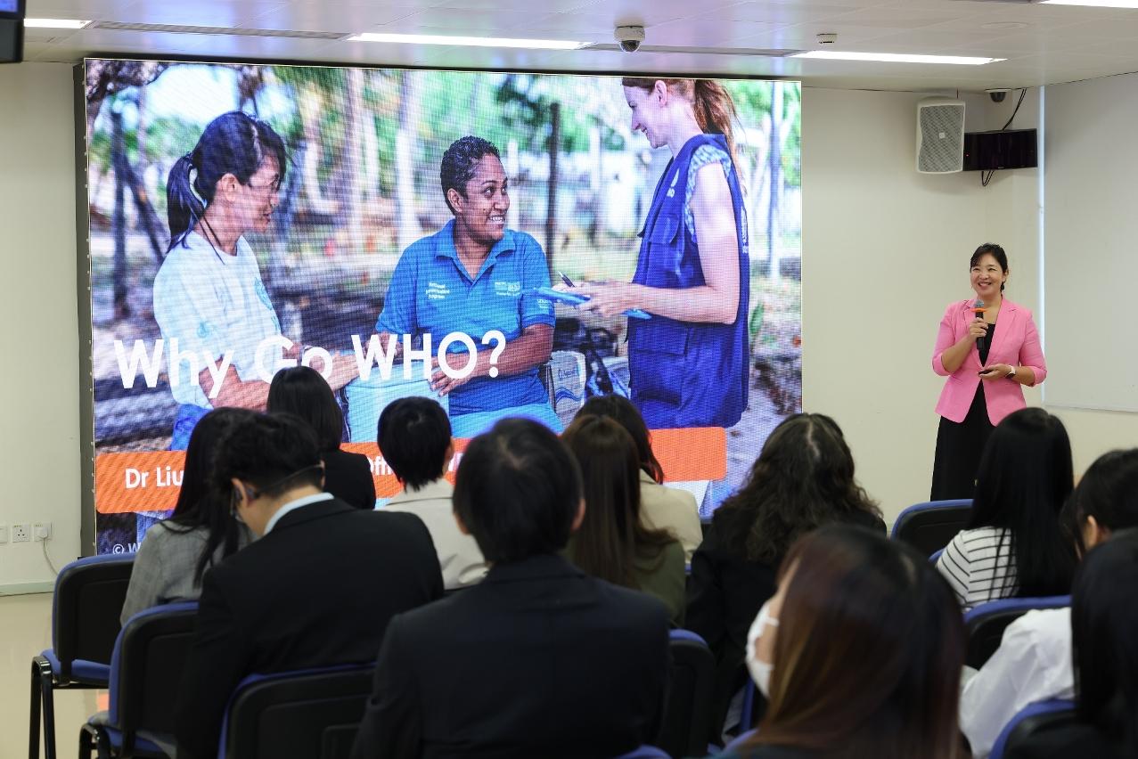 Em seguida, a Directora Executiva do Gabinete da Região do Pacífico-Ocidental da OMS, Dra. Liu Yue, e o Director do Gabinete, Dr. Tamás LANDESZ, fizeram uma apresentação sobre a história da fundação, a estrutura e as principais funções da OMS. Foram também realizadas sessões de esclarecimento sobre o desenvolvimento da carreira profissional dentro da OMS, o processo de recrutamento, a elaboração do curriculum vitae e da carta de candidatura, e também sobre técnicas para as provas escritas e entrevistas. Os representantes partilharam as suas experiências pessoais de trabalho, dando aos formandos uma valiosa referência prática e inspiração, também responderam pacientemente às perguntas durante a sessão de divulgação, criando um ambiente caloroso de discussão.