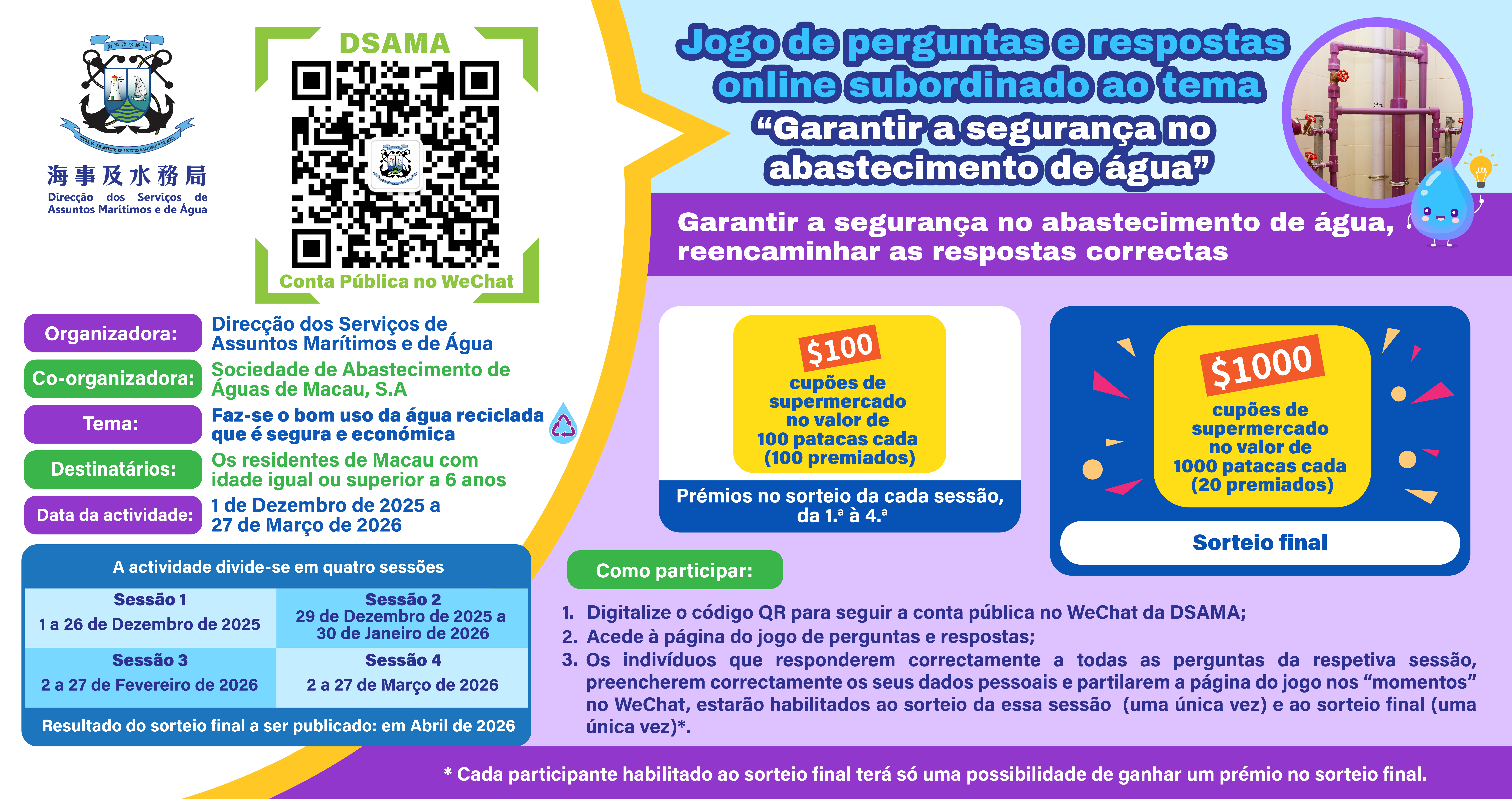 Organizado pela DSAMA e co-organizado pela Sociedade de Abastecimento de Águas de Macau, S.A, o referido jogo está subordinado ao tema “Aproveitemos bem a água reciclada, que é segura e económica!”, com perguntas que incidem sobre a segurança no abastecimento de água e o uso da água reciclada. O jogo decorre a partir de hoje até 27 de Março de 2026, e tem quatro fases, cada uma com a duração aproximada de um mês. No final de cada fase, serão sorteados 100 vencedores, cada um receberá um vale de compras de supermercado no valor de MOP100. Terá também lugar um sorteio do grande prémio, em que serão sorteados 20 vencedores, cada um receberá vales de compras de supermercado no valor total de MOP1000. Os residentes de Macau interessados podem participar no jogo e obter mais informações através da conta oficial do WeChat da DSAMA.