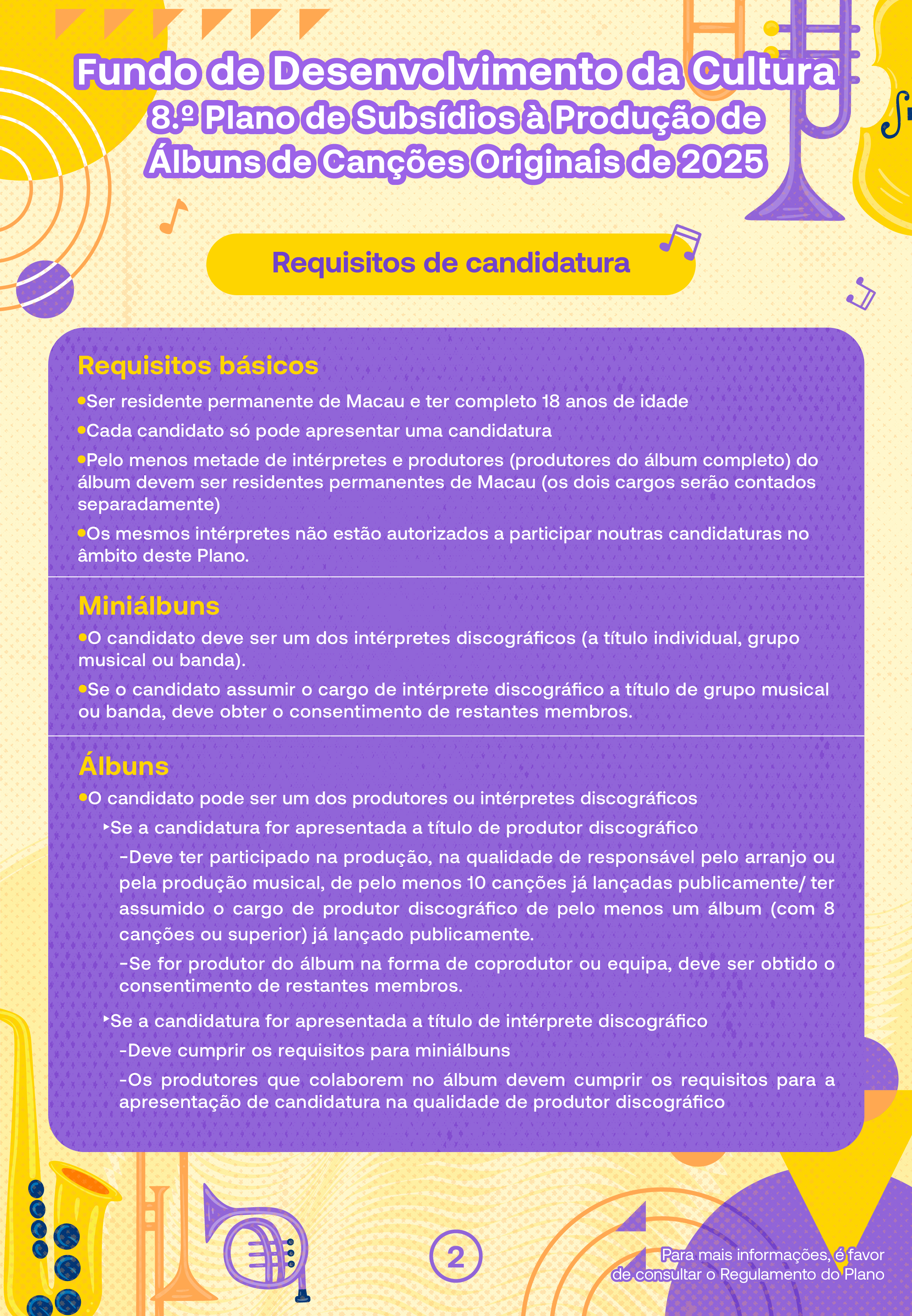 O período de candidatura decorrerá de 31 de Dezembro de 2025 a 13 de Fevereiro de 2026. Os álbuns a subsidiar são de dois tipos, nomeadamente, “miniálbuns” e “álbuns”, excluindo as colectâneas musicais e os álbuns de grandes êxitos. Todas as canções devem ser obras originais, inéditas e não encomendadas, com um mínimo de 3 canções para “miniálbuns” e um mínimo de 6 canções para “álbuns”. Os álbuns financiados devem ser distribuídos digitalmente em pelo menos 4 plataformas comerciais de música digital, pelo menos uma das quais deve ser plataforma relevante do Interior da China, devendo os intérpretes participar em pelo menos um evento público offline e interpretar pelo menos uma canção do álbum financiado. Cada candidatura deve incluir apenas a produção de um miniálbum ou de um álbum.