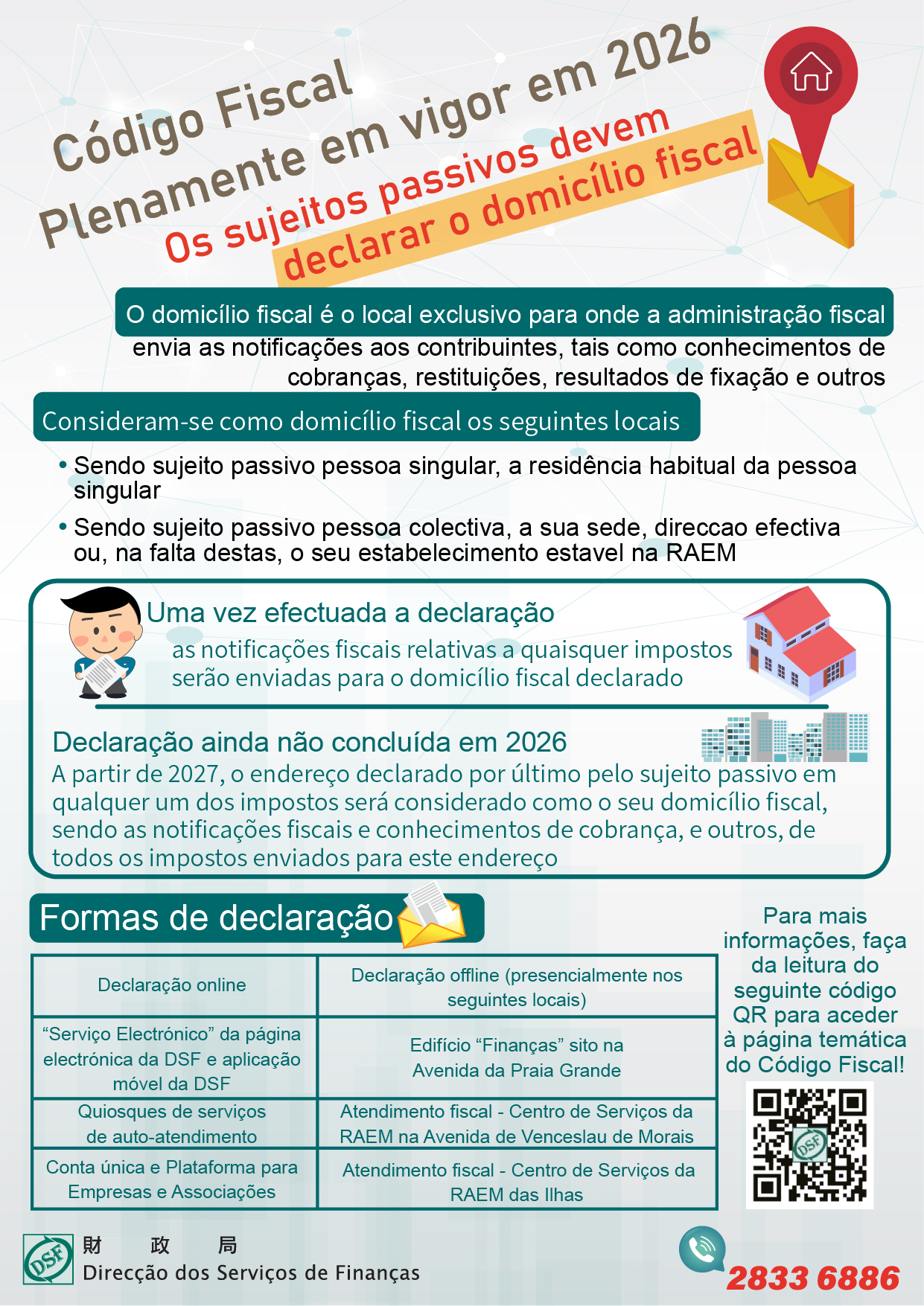 Em articulação com a entrada vigor do Código Fiscal, os sujeitos passivos devem, nos termos legais, declarar o domicílio fiscal junto da administração fiscal no período de 1 de Janeiro a 31 de Dezembro de 2026. O domicílio fiscal é o local exclusivo para onde a administração fiscal envia as notificações fiscais aos contribuintes, tais como conhecimentos de cobrança, restituições, resultados de fixação e outros.