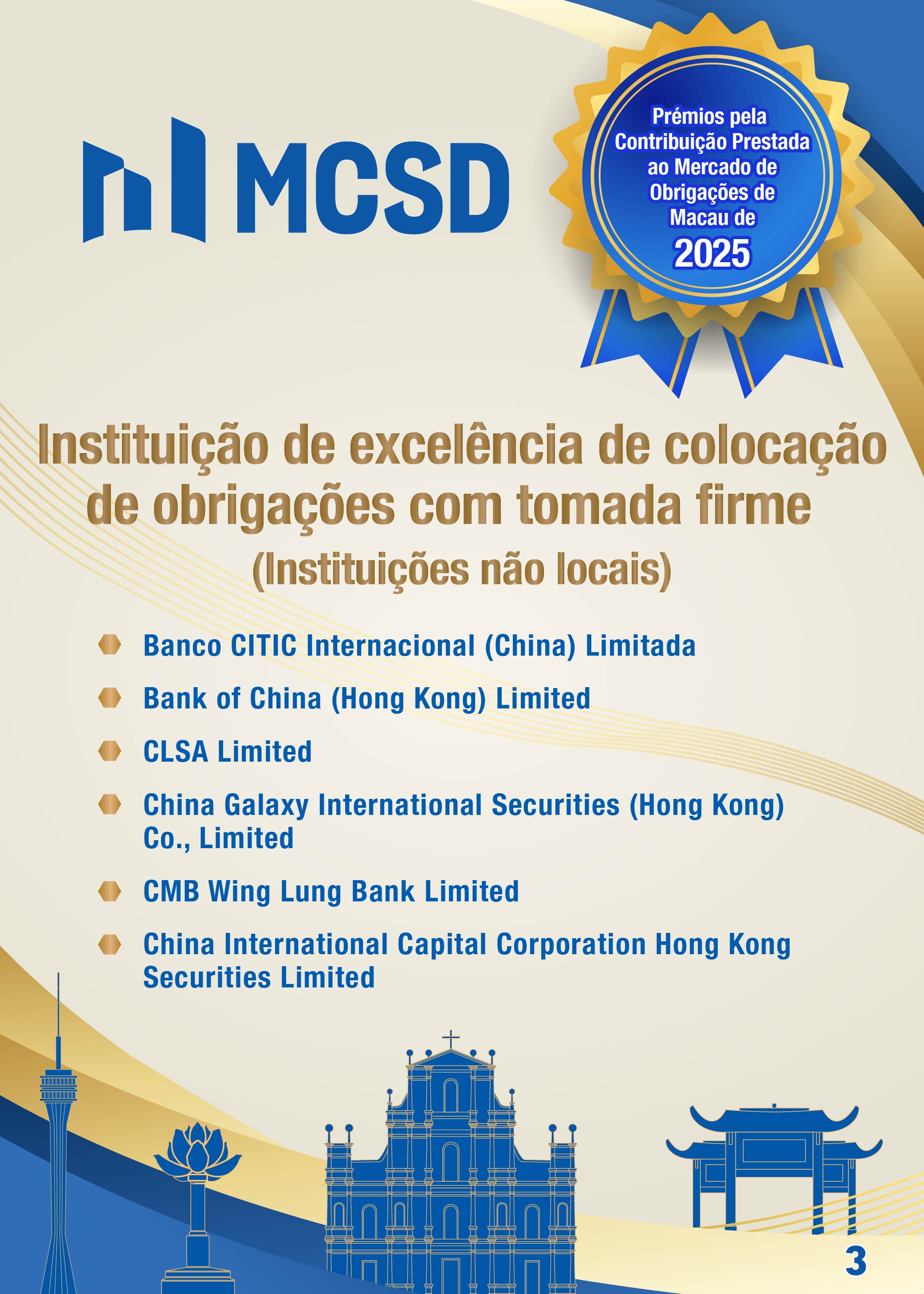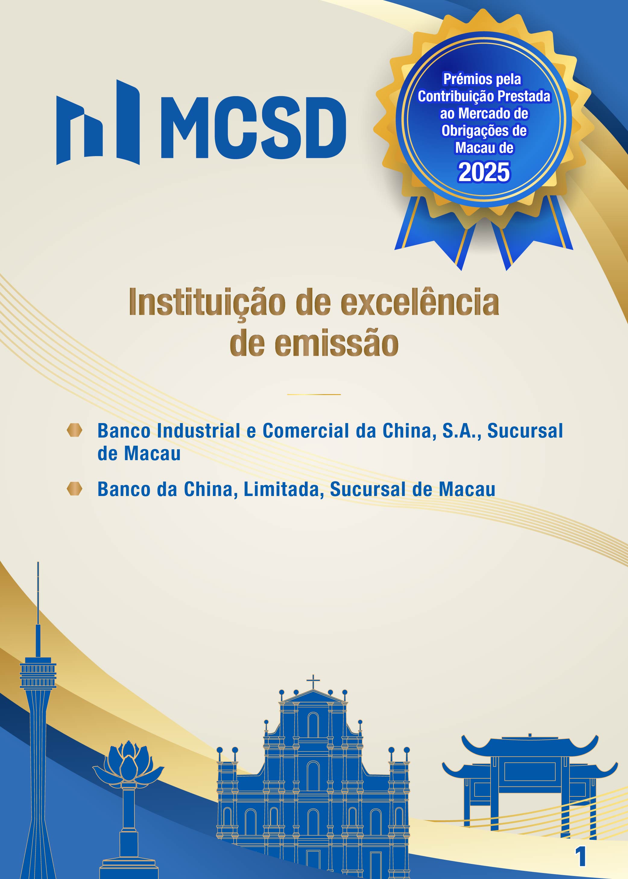 A Central de Depósito e Liquidação de Valores Mobiliários de Macau Sociedade Unipessoal Limitada (doravante designada por “MCSD”) realizou hoje (dia 21), no Salão de Convenções do Centro de Ciência de Macau, a Comemoração do 4.º Aniversário da Fundação da MCSD e a Cerimónia de Atribuição de Prémios pela Contribuição Prestada ao Mercado de Obrigações de Macau de 2025, com vista a reconhecer e homenagear os participantes do mercado que contribuíram para o desenvolvimento do mercado de obrigações de Macau ao longo do ano de 2025.