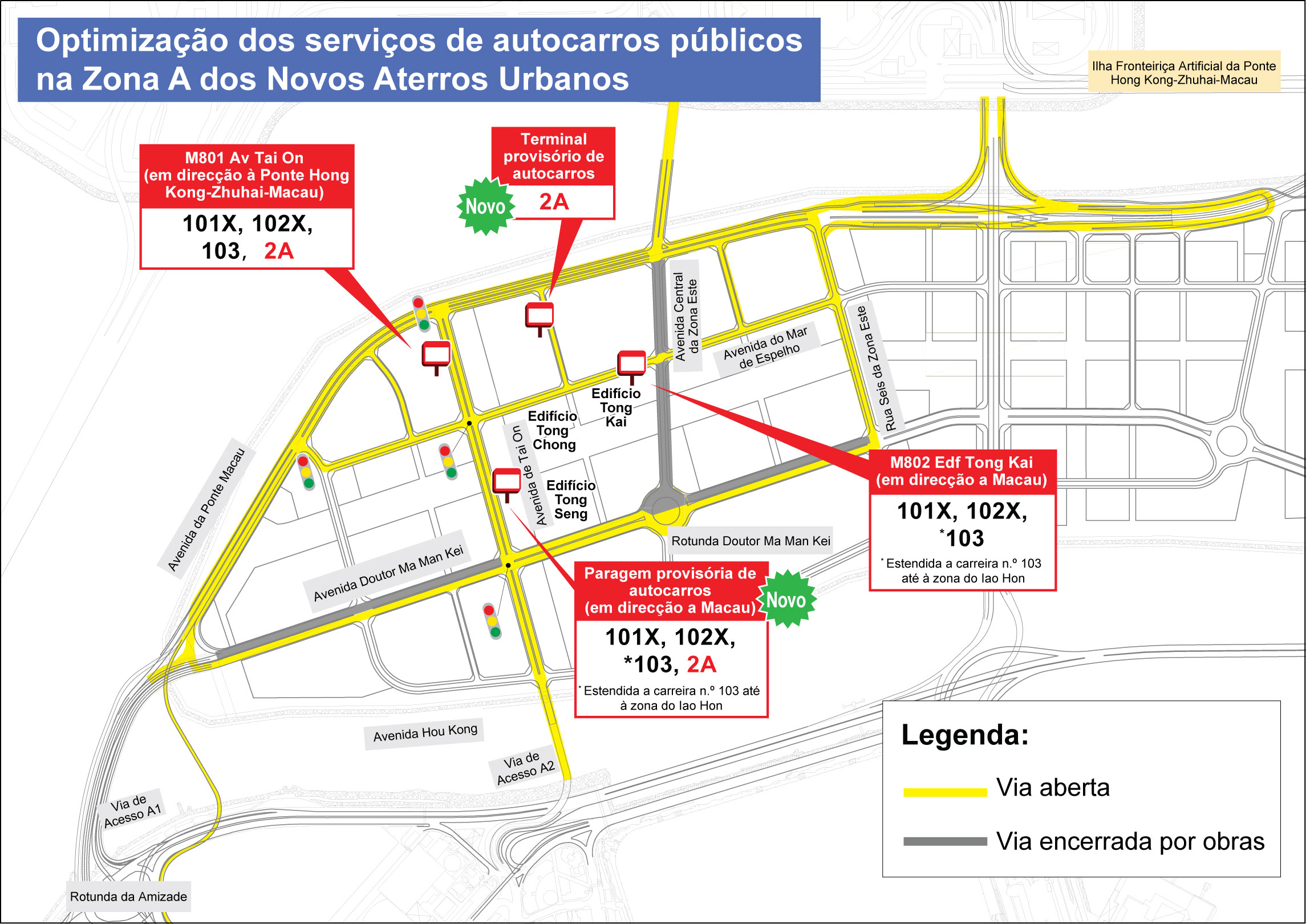 Para facilitar o acesso dos residentes da Zona A dos Novos Aterros às zonas de equipamentos de subsistência e instalações sociais públicas, após avaliação das condições reais e equilíbrio na distribuição de recursos de transportes públicos, serão gradualmente optimizados os serviços de autocarros públicos na Zona A, incluindo a criação de uma paragem provisória de autocarros na Avenida de Tai On, entre o Edifício Tong Seng e o Edifício Tong Chong, com vista a estender a carreira n.º 2A até à Zona A, e a criação de um terminal provisório de autocarros na Rua Três da Zona Este como terminal, aumentando assim as opções de deslocação para a Zona Centro e Sul; planeia-se, além disso, a expansão da carreira n.º 103 para abranger a área do Bairro Iao Hon, proporcionando aos residentes mais opções de deslocação e correspondência, ao mesmo tempo que se optimiza o percurso pedonal até às paragens de autocarro e a distância respectiva. As medidas em causa estão previstas para serem implementadas antes do Ano Novo Chinês.