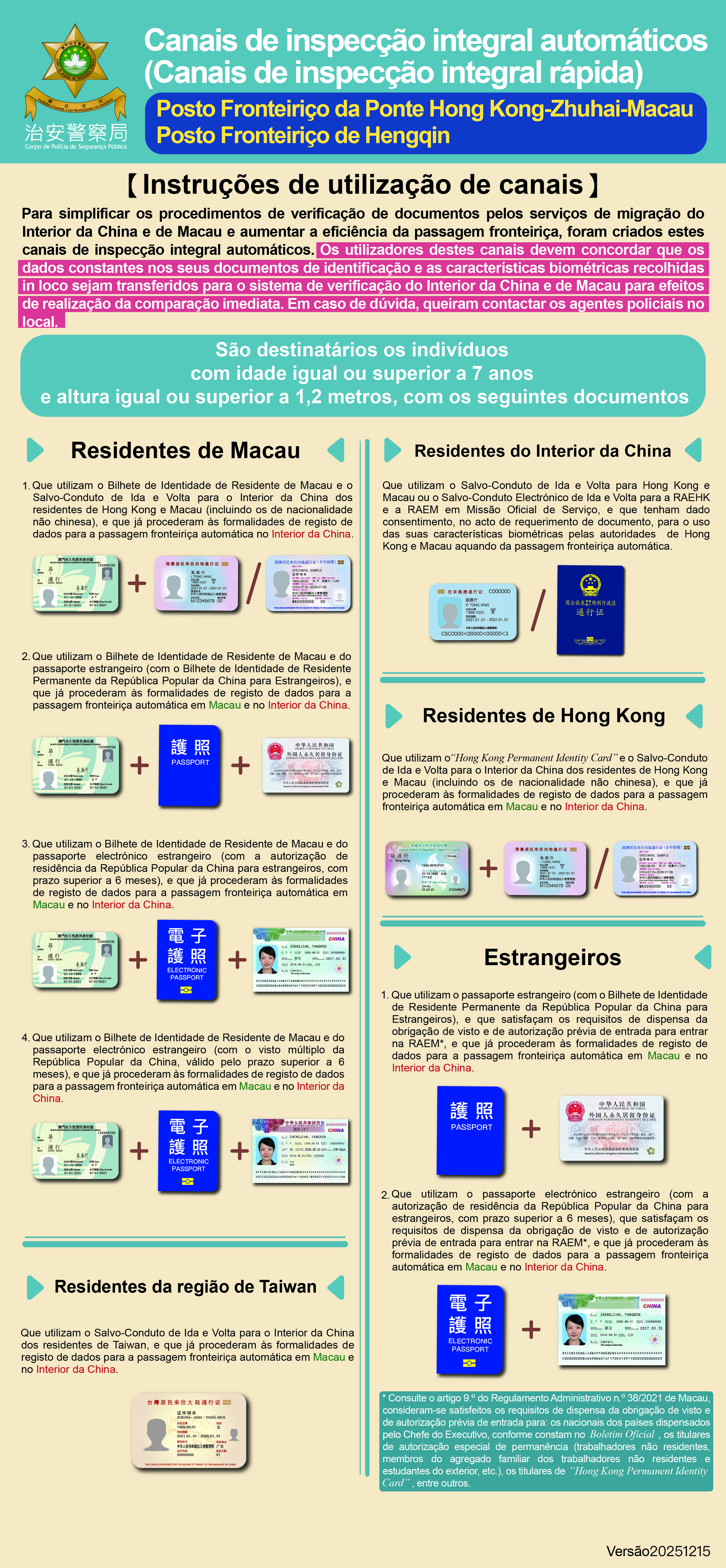 Tendo em conta a implementação suave da referida medida de alargamento no Posto Fronteiriço Hengqin, que facilita a circulação transfronteiriça de estrangeiros, os serviços de controlo fronteiriço de Macau e de Zhuhai, depois de negociações, concordaram e decidiram, por unanimidade, alargar, a partir de 26 de Janeiro de 2026, a medida aos canais de inspecção integral automáticos do Posto Fronteiriço Zhuhai-Macau da Ponte Hong Kong-Zhuhai-Macau, permitindo às referidas pessoas titulares de passaporte estrangeiro utilizar esses canais.