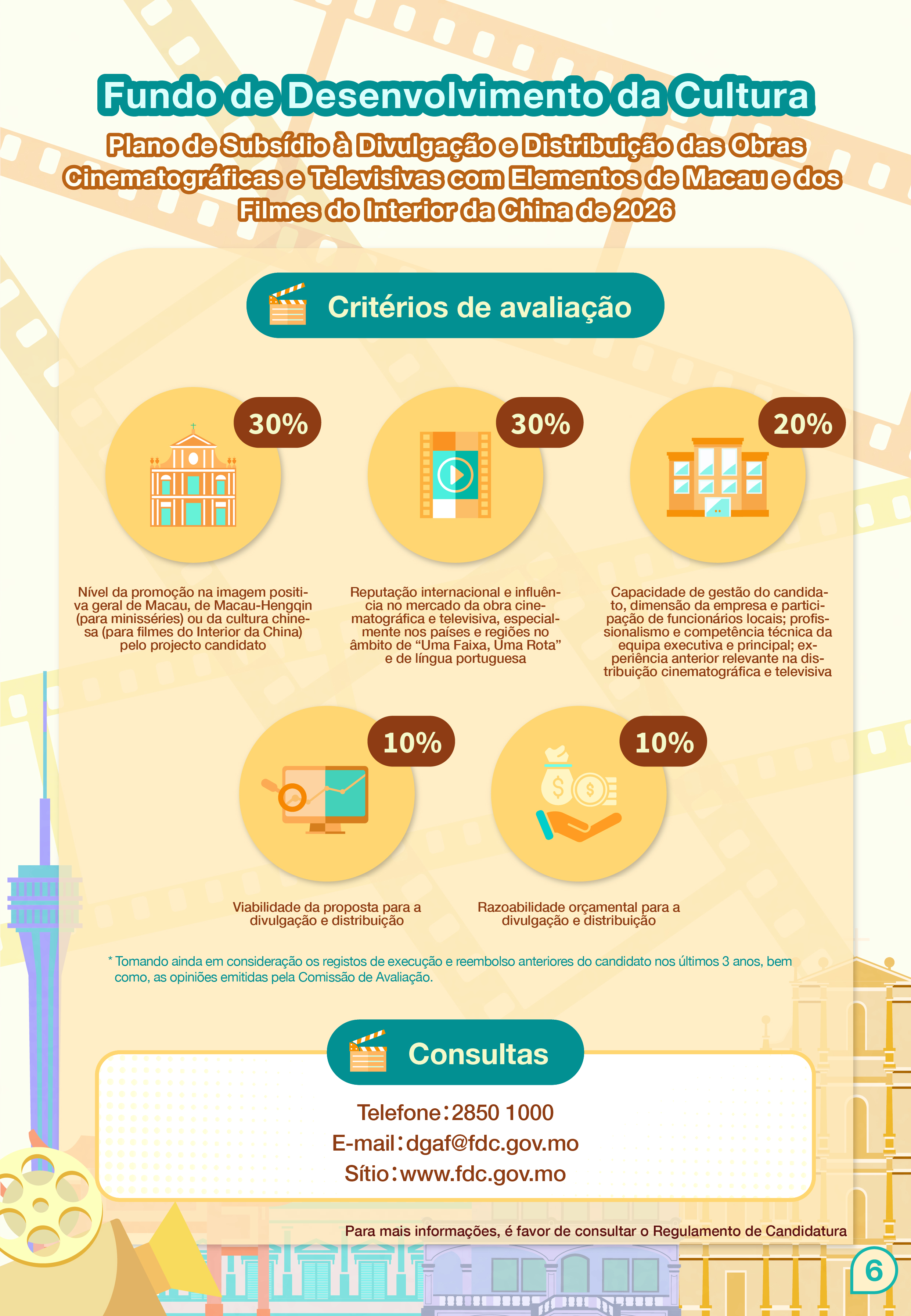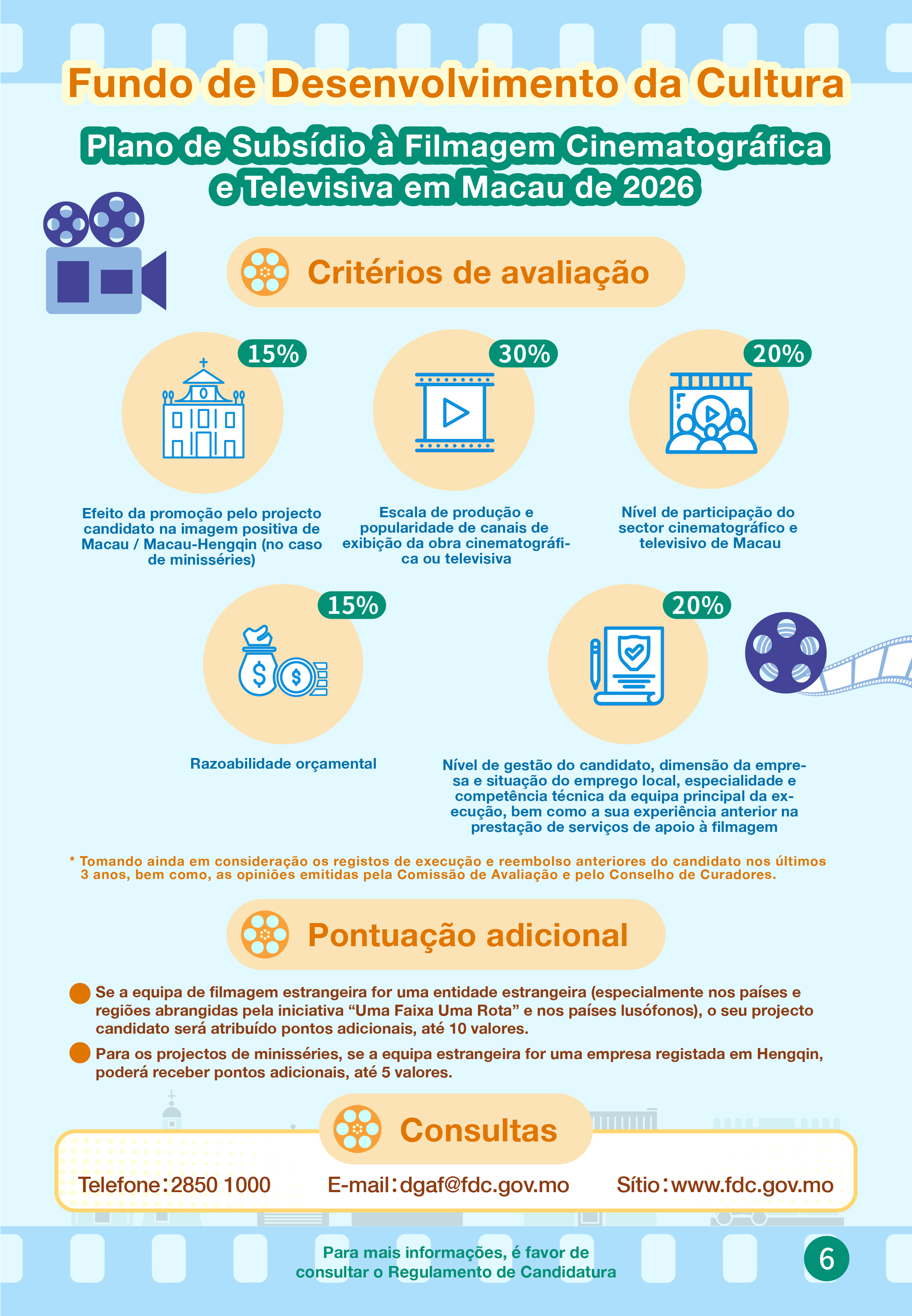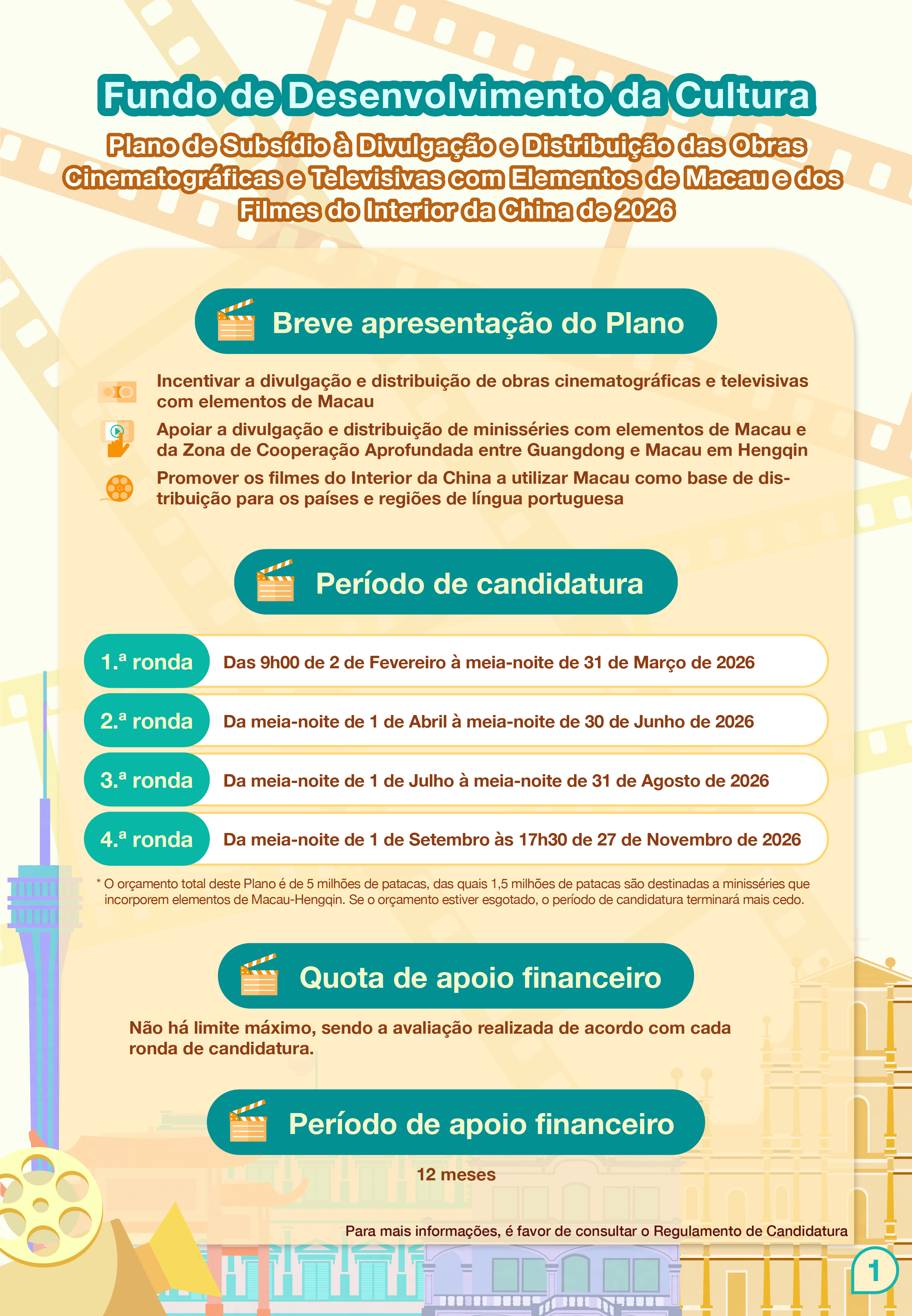 O Fundo de Desenvolvimento da Cultura (FDC) continuará a promover, em 2026, a indústria cinematográfica e televisiva de Macau, aperfeiçoando os dois planos de apoio financeiro, designadamente, “Plano de Subsídio à Divulgação e Distribuição das Obras Cinematográficas e Televisivas com Elementos de Macau e dos Filmes do Interior da China” e “Plano de Subsídio à Filmagem Cinematográfica e Televisiva em Macau”, no intuito de incentivar ainda mais a filmagem, divulgação e distribuição de minisséries com elementos de Macau e da Zona de Cooperação Aprofundada entre Guangdong e Macau em Hengqin. Por outro lado, serão apoiados os filmes do Interior da China que utilizem Macau como base de distribuição para países e regiões de língua portuguesa, aproveitando assim o papel de Macau como ponte cultural.