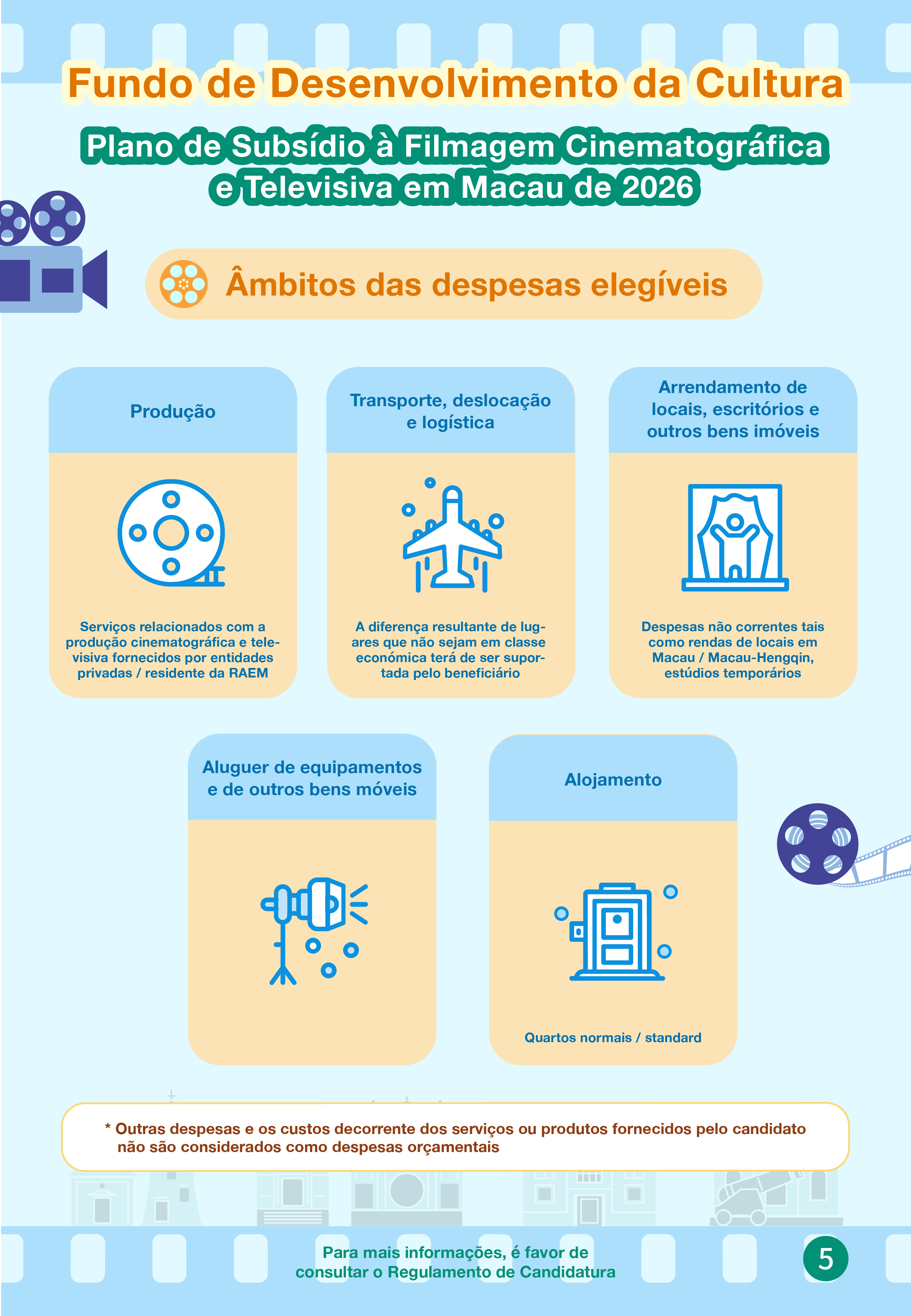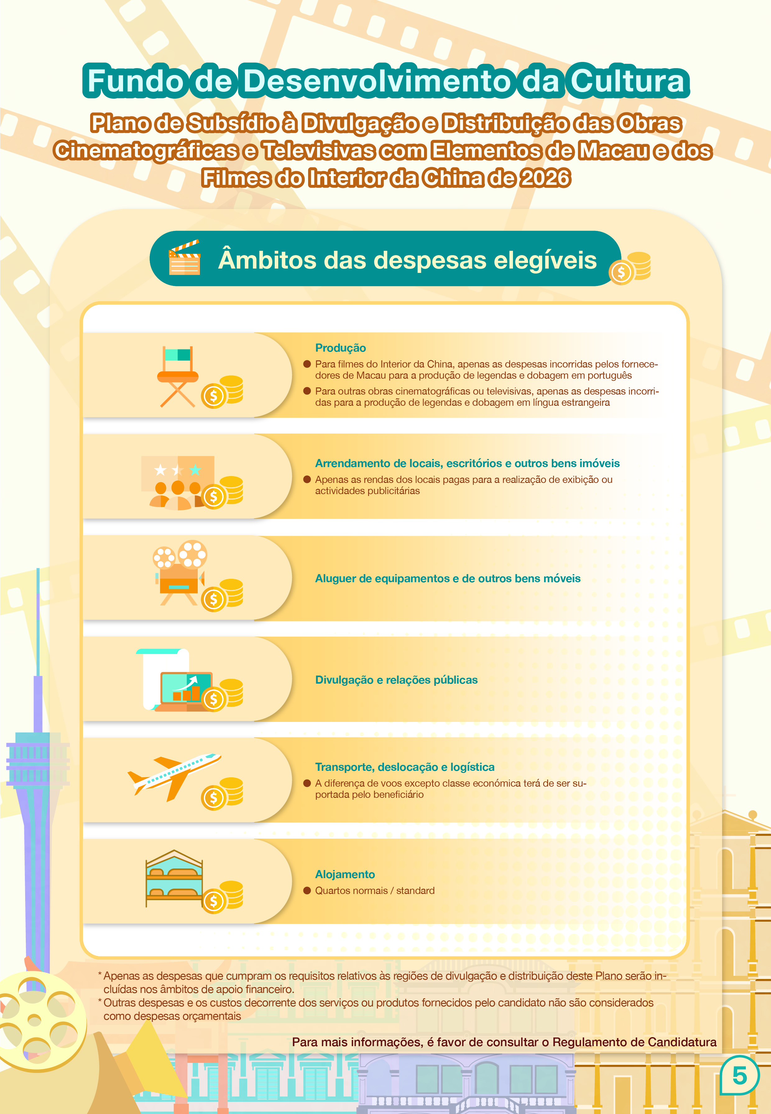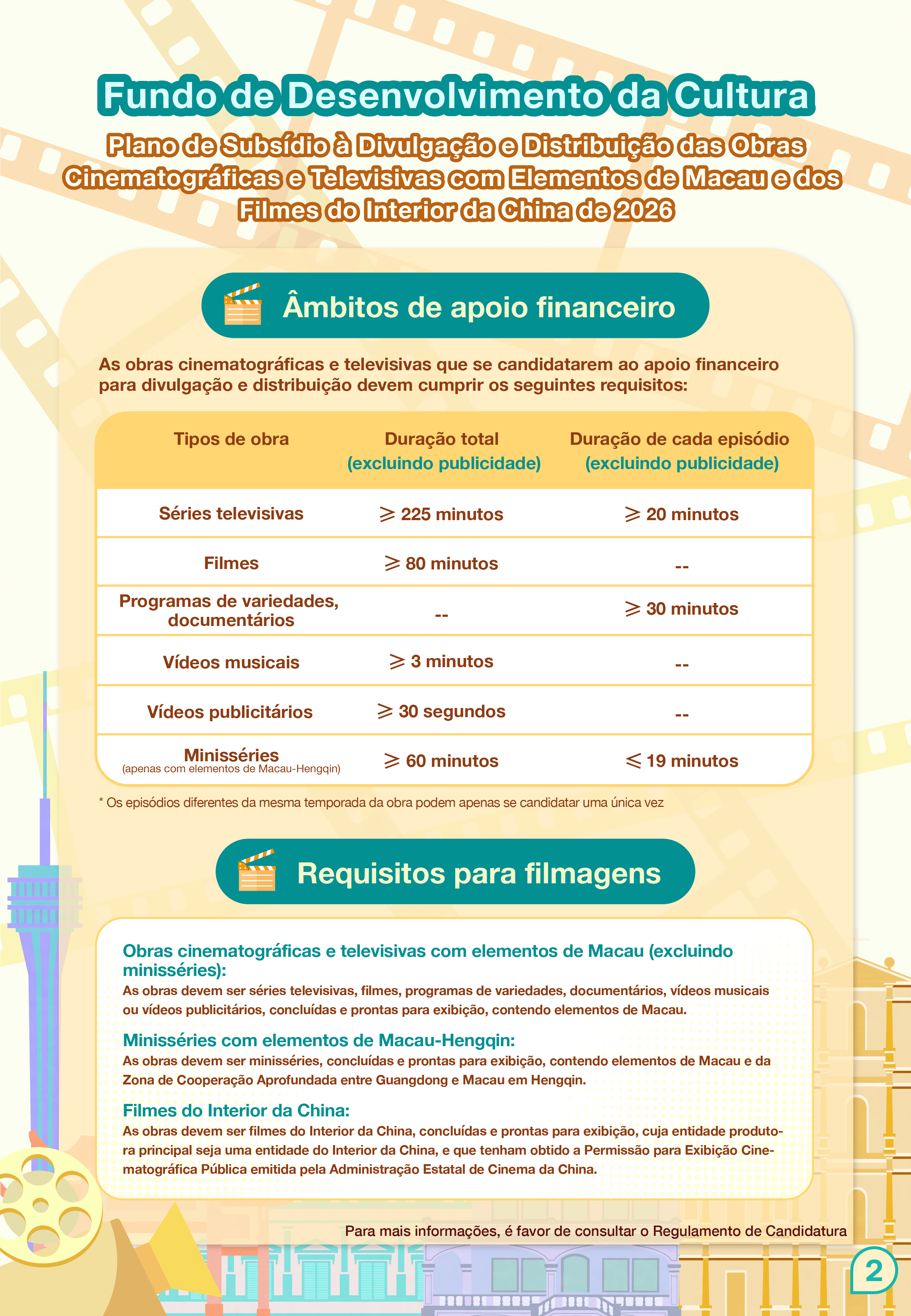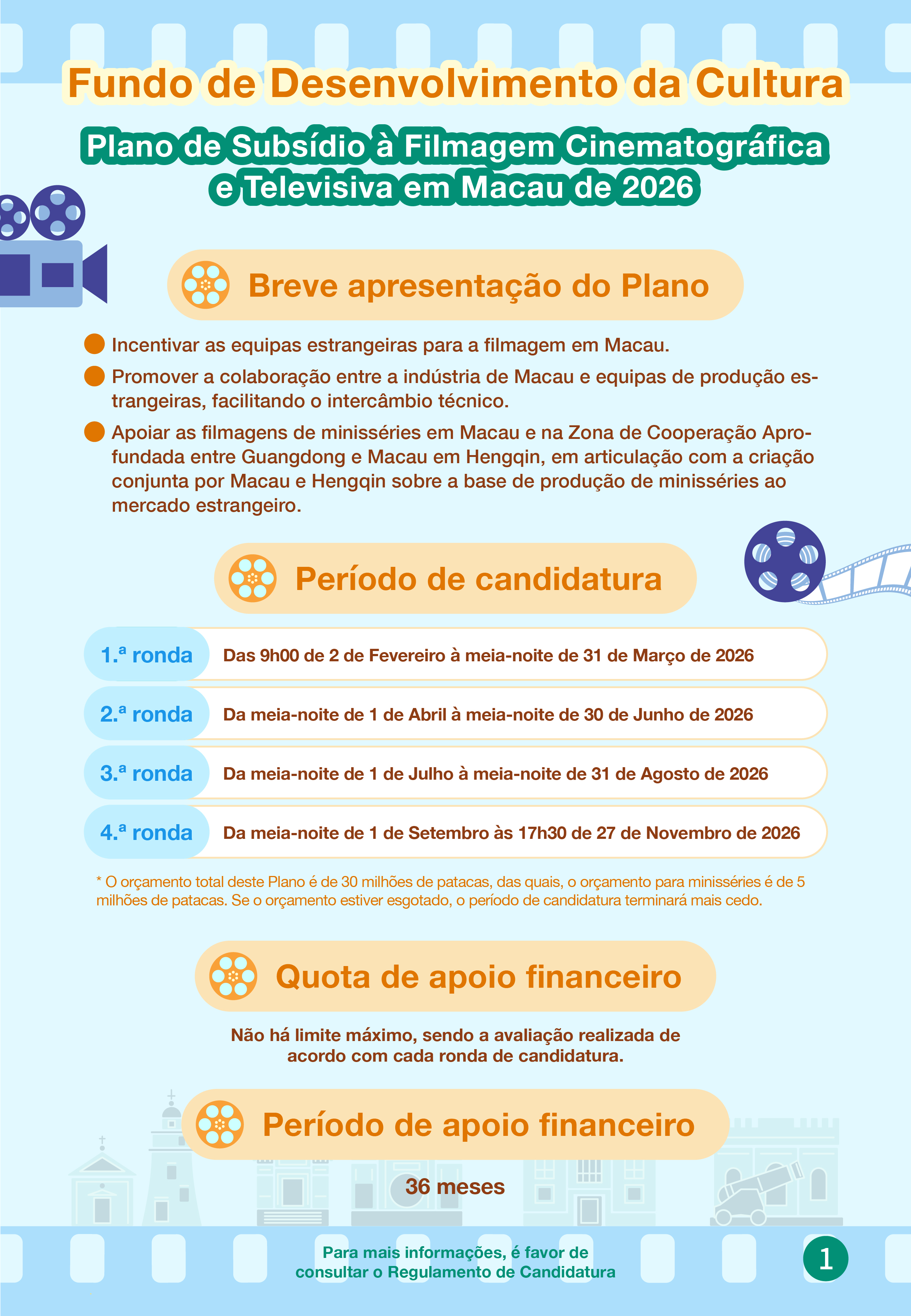 O Fundo de Desenvolvimento da Cultura (FDC) continuará a promover, em 2026, a indústria cinematográfica e televisiva de Macau, aperfeiçoando os dois planos de apoio financeiro, designadamente, “Plano de Subsídio à Divulgação e Distribuição das Obras Cinematográficas e Televisivas com Elementos de Macau e dos Filmes do Interior da China” e “Plano de Subsídio à Filmagem Cinematográfica e Televisiva em Macau”, no intuito de incentivar ainda mais a filmagem, divulgação e distribuição de minisséries com elementos de Macau e da Zona de Cooperação Aprofundada entre Guangdong e Macau em Hengqin. Por outro lado, serão apoiados os filmes do Interior da China que utilizem Macau como base de distribuição para países e regiões de língua portuguesa, aproveitando assim o papel de Macau como ponte cultural.