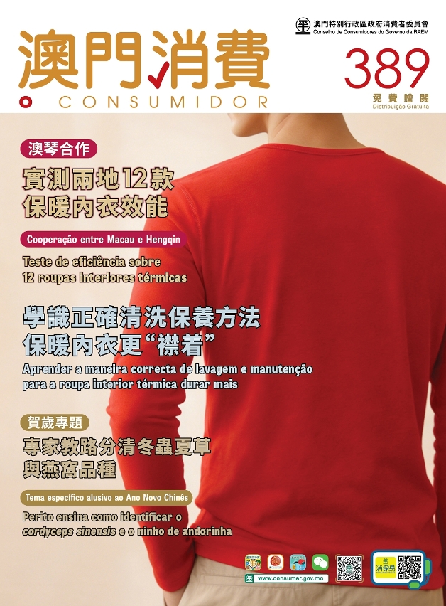 Além disso, nesta edição do “O Consumidor” foi publicada uma entrevista do assessor do sector de lavandaria do Centro de Mediação e de Arbitragem de Conflitos de Consumo de Macau (CMACCM), Sr. Chang Heng Vo, para apresentar a maneira correcta de lavar as roupas interiores térmicas, sobretudo aquelas de lã, de modo a manter-lhes o efeito térmico e a vida útil.