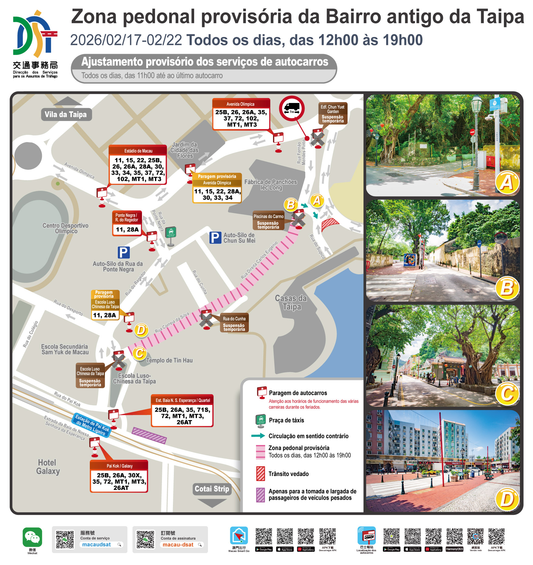 No que respeita ao serviço de autocarros, para acompanhar a criação das zonas pedonais exclusivas e as medidas de desvio provisório durante os feriados, serão implementados os seguintes ajustamentos temporários nas paragens e carreiras de autocarros nas imediações do bairro antigo da Taipa e da Rua de Nossa Senhora do Amparo: