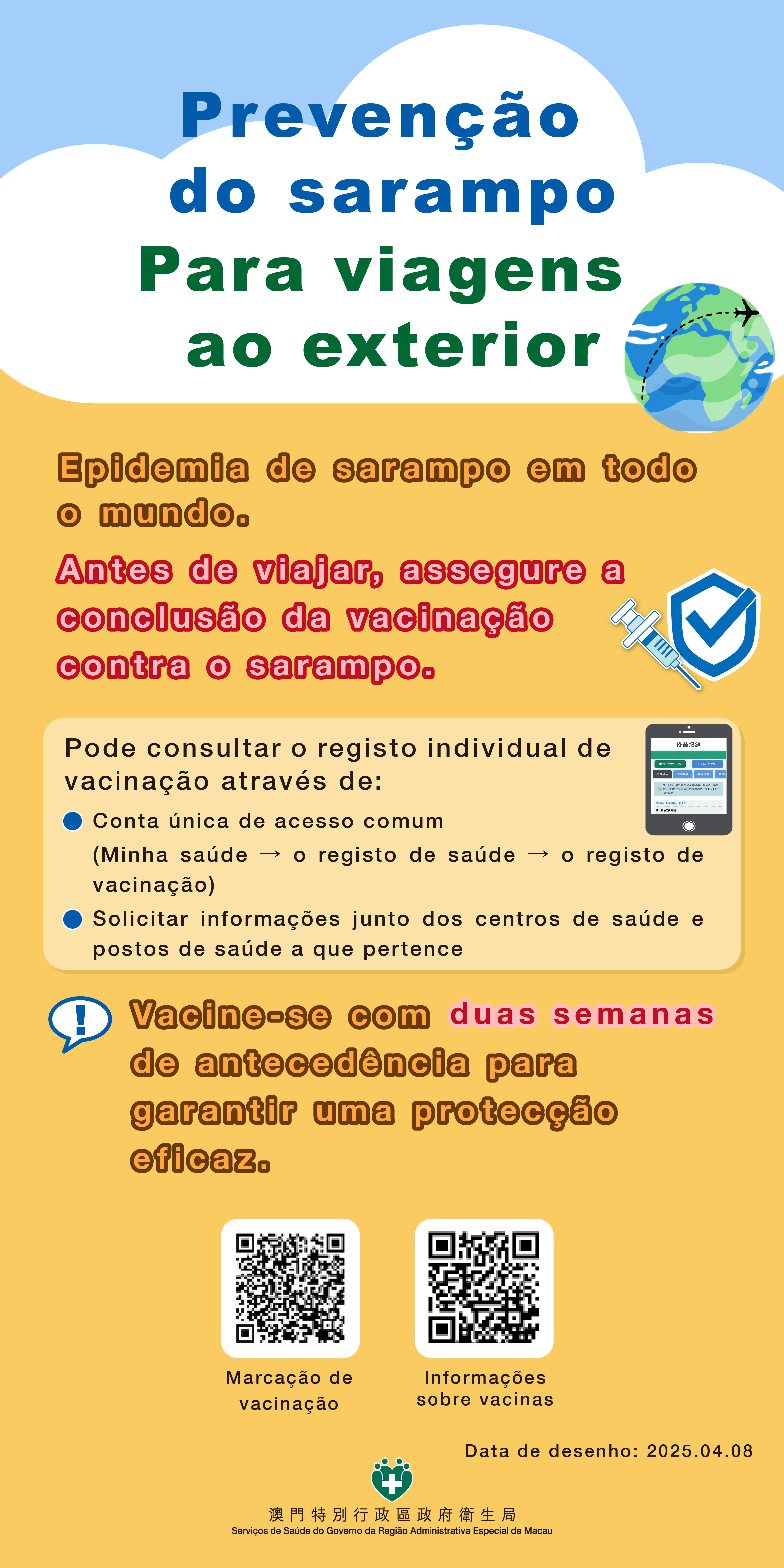 Os Serviços de Saúde continuam a acompanhar de perto a situação epidemiológica do sarampo em todo o mundo. Em tempos recentes, observou-se um aumento substancial de casos de sarampo em diversas regiões do Japão, tendo-se verificado uma propagação contínua da doença na Indonésia e nas Filipinas, entre outros países, bem como na Europa e nos Estados Unidos da América. Os Serviços de Saúde apelam os residentes viajem para fora para assegurarem que a vacinação contra o sarampo está concluída e, para os indivíduos que ainda não possuem imunidade, que a completem com uma antecedência mínima de duas semanas. As crianças não vacinadas e as grávidas sem imunidade devem evitar deslocar-se às zonas afectadas pelo sarampo.