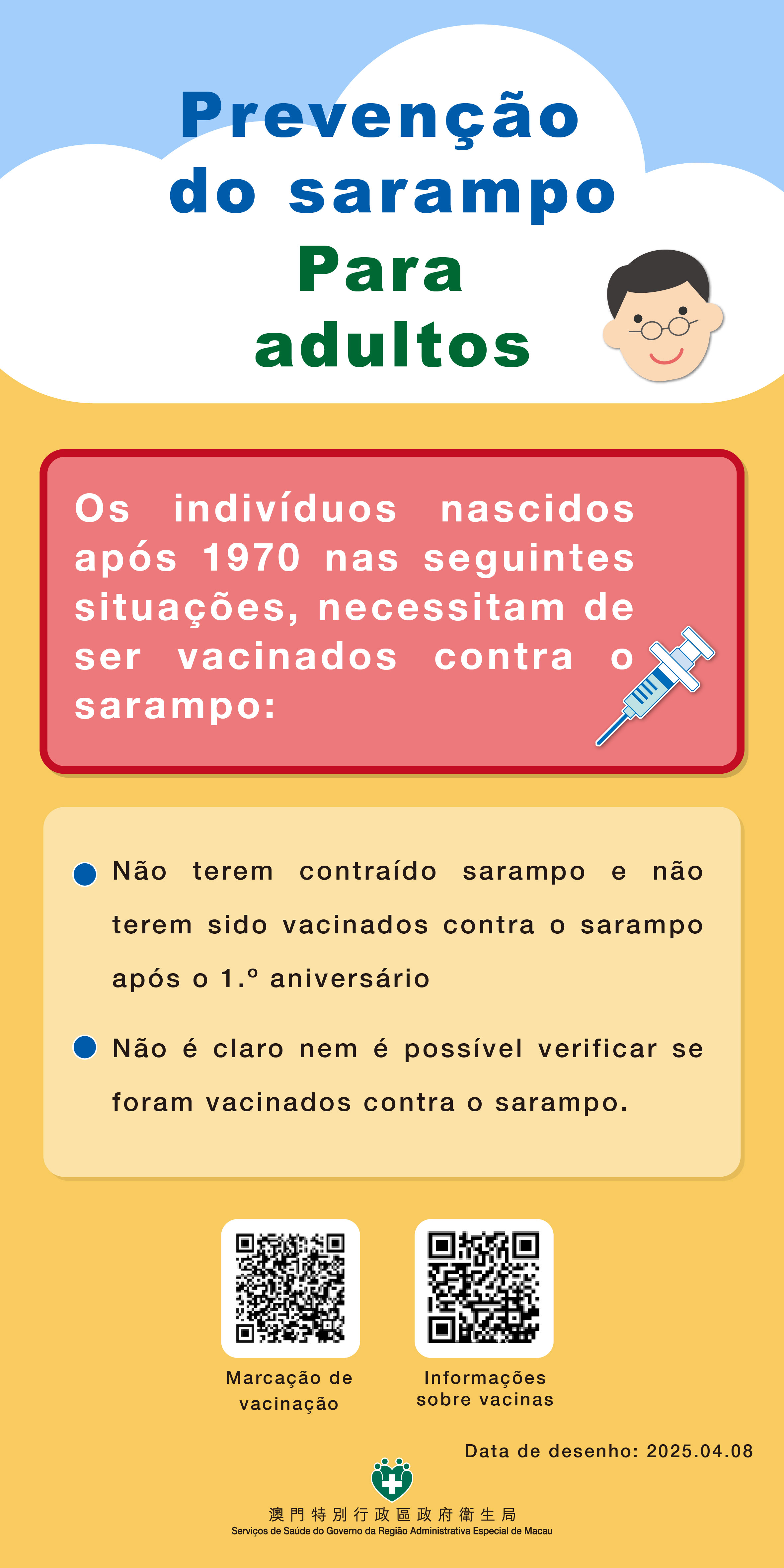 Em 2014, Macau obteve a acreditação da Organização Mundial de Saúde (OMS), tornando-se no primeiro país e região da Região do Pacífico Ocidental a eliminar o sarampo, mantendo-se a respectiva acreditação. Actualmente, embora Macau não seja uma região afectado por uma epidemia de sarampo, enquanto cidade turística, persiste o risco de importação e propagação do sarampo. Os Serviços de Saúde salientam que a vacinação contra o sarampo constitui o método mais eficaz para prevenir a infecção e reduzir a transmissão do sarampo, apelando aos residentes nascidos em ou depois de 1970 e que não estejam imunes à epidemia devem assegurar a conclusão da vacinação antes de se deslocarem às regiões afectadas, sendo recomendável, nomeadamente, que: