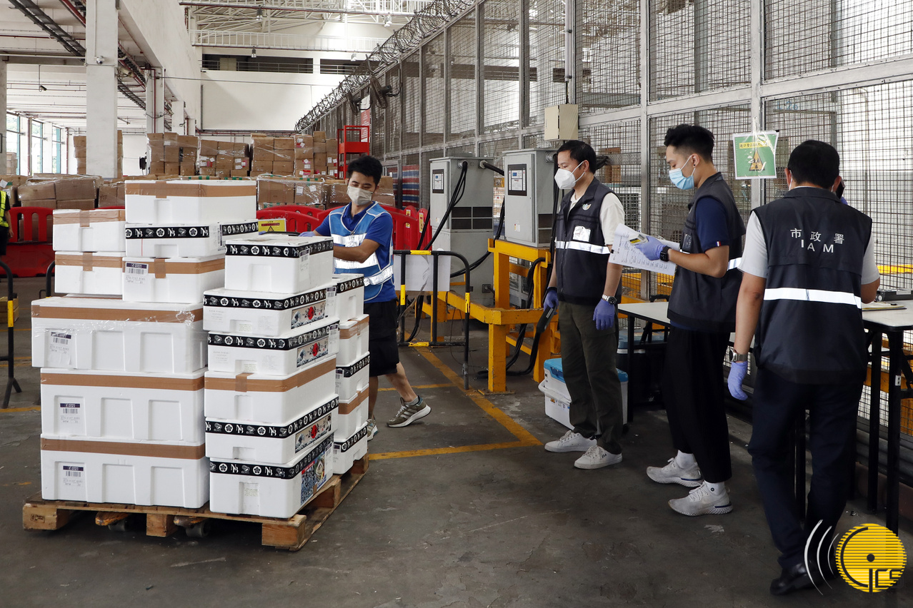 日本鲜活水产主要透过空运来澳,依法申报预约检验检疫的水产品到达澳门机场仓库待检区后,市政署检疫人员会先以手提辐射监测仪全覆盖地对每批的每箱货物外围进行辐射水平检测。