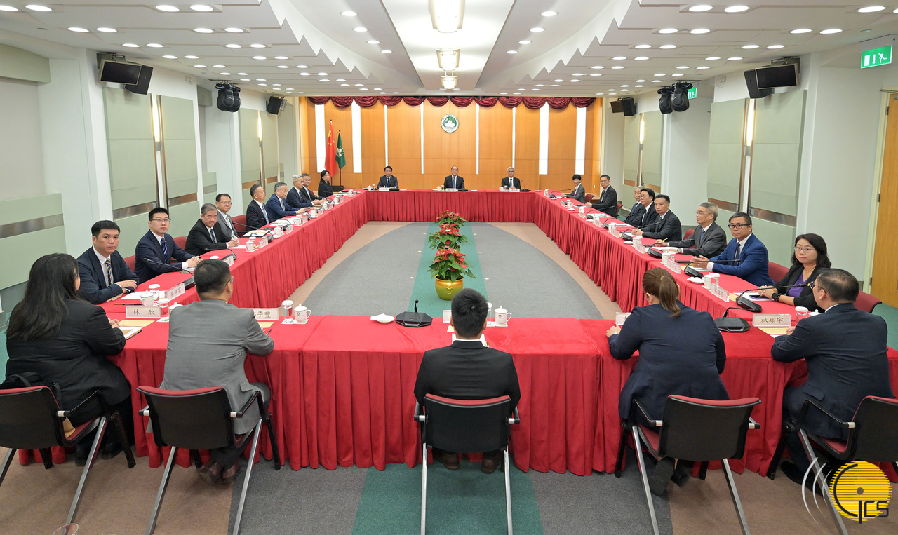行政长官贺一诚与澳门工会联合总会一行座谈,就制定2024年财政年度施政报告听取意见和建议。