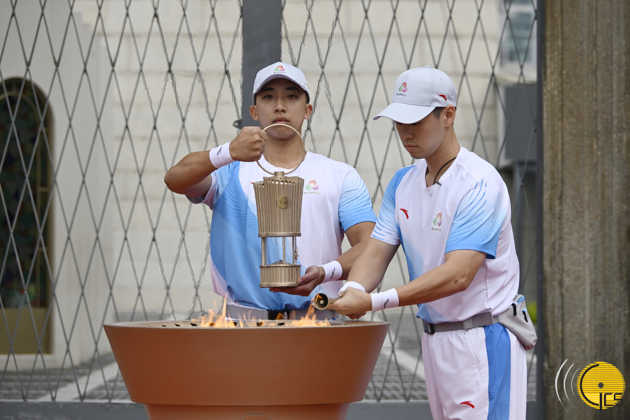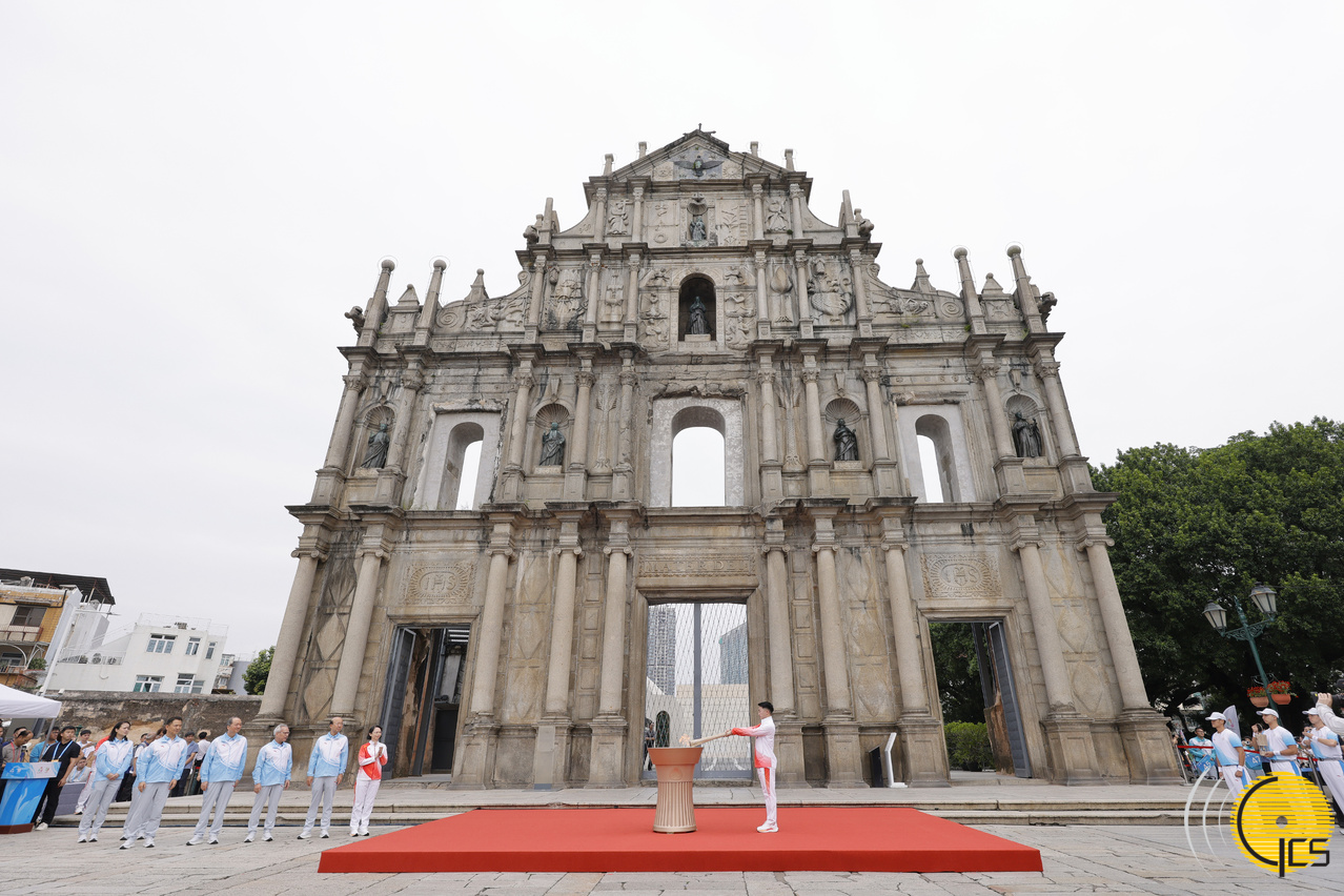 最后一棒火炬手 — 澳门空手道运动员郭建恒跑到终点大三巴牌坊,并点燃火种盆。