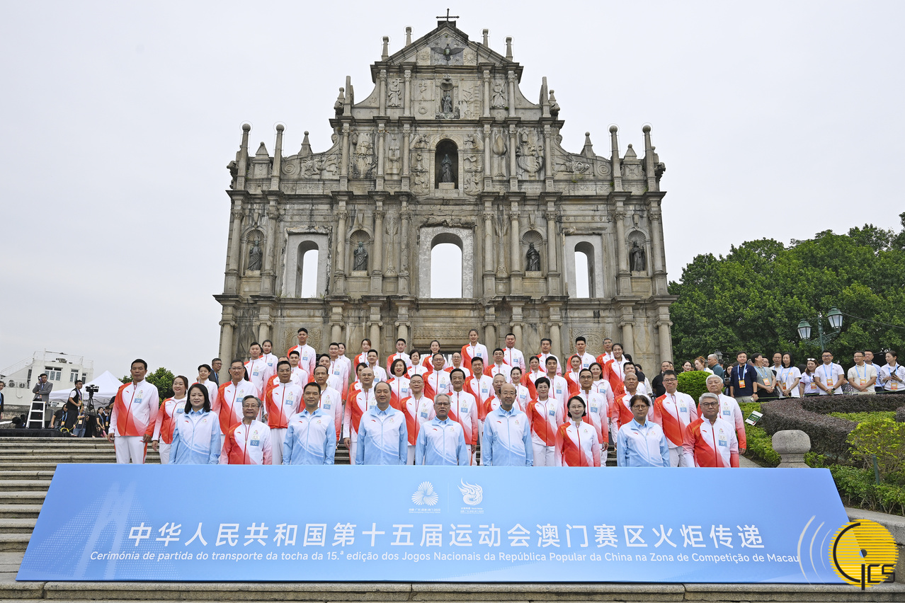 十五运会组委会和残特奥会组委会执行主任、行政长官岑浩辉与出席火炬传递活动的嘉宾及50位火炬手合影。