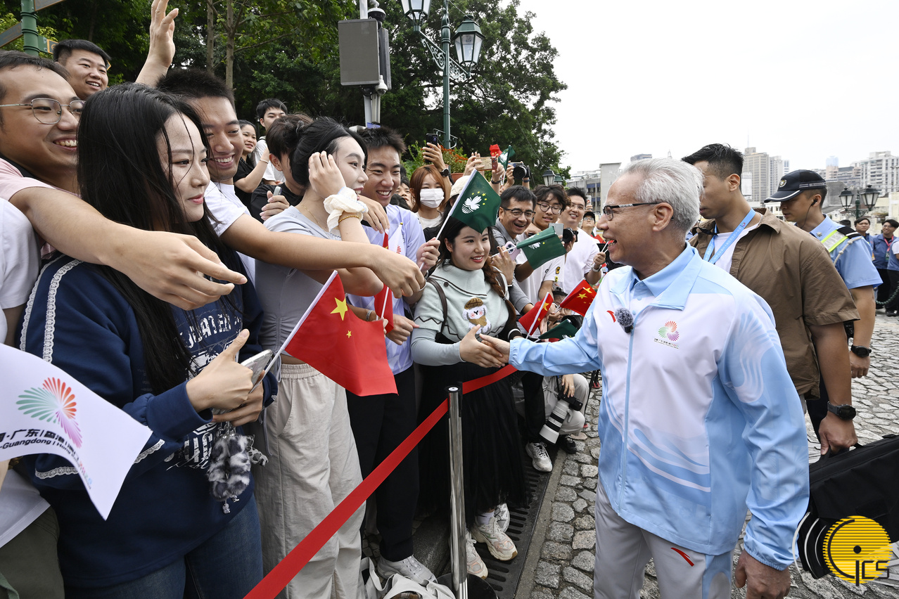 十五运会组委会和残特奥会组委会执行主任、行政长官岑浩辉与沿途观看火炬传递的市民和旅客握手问好,亲切交谈。