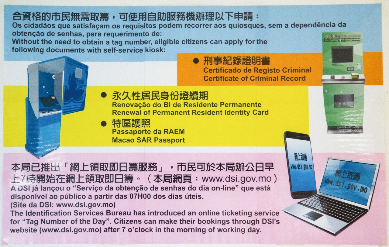 身份证明局发展自助服务至今已有15年的历程,起步领先内地、香港,以至其他邻近国家和地区。自助服务的发展主要建立在智能身份证的基础上,澳门首张智能身份证在2002年发出,当时在世界处于领先地位,目的是透过发出具高安全性的电子证件,让居民利用身份证确认身份后使用各项电子化服务。2004年,第一台自助服务机投入使用,让居民利用智能身份证自行列印入境香港使用的申报表,使居民初次接触自助服务。经过不断创新、实验及持续完善,2012年首台自助办证机正式投入使用,推出《刑事纪录证明书》自助办理服务。当时,自助办证机在市场上并不普及,市场上没有可供采购的预制机组,因此,身份证明局按照办证流程的需要自行进行设计及模型制作,经过多次试验后,交由深圳的公司生产。