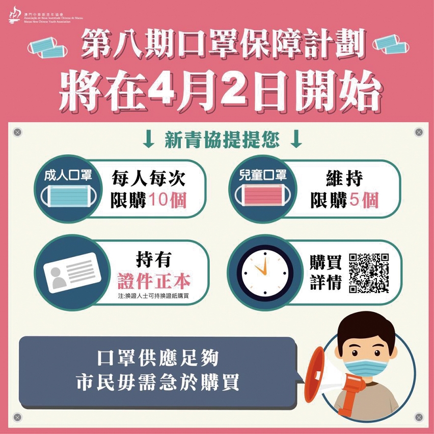 随着政府推出口罩供应计划,澳门市民可到各售卖点购买口罩,但不少长者难以支撑长时间的轮购过程,为此,街总特别上门帮助行动不便的长者,其辖下9个服务点亦协助政府售卖口罩,减少长者的轮候时间和群聚带来的风险。另外,街总亦对物资短缺的长者家户,分发由热心企业捐赠的新鲜蔬菜和消毒用品,让弱势群体在逆境中感受到温暖的关怀。