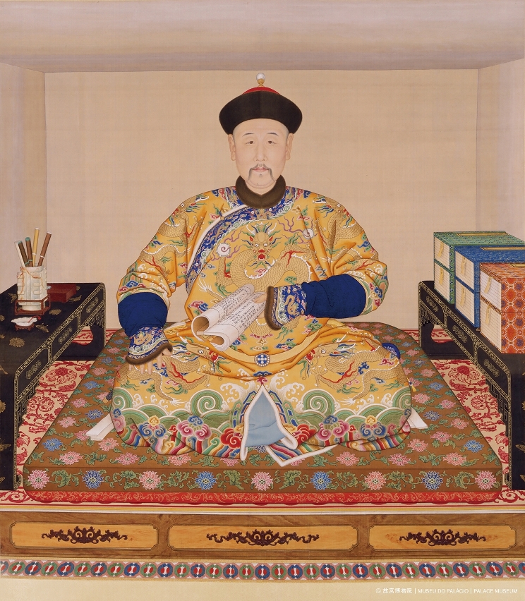 读书像是清代宫廷绘画中经常表现的题材之一。画作显示了清代皇帝勤于学习,勤于政事,运用书中知识管理天下家国的形象。在清代十二个皇帝之中,爱新觉罗•胤禛(雍正皇帝)是一位十分勤奋的皇帝。此图绘胤禛身着吉服,左手持书,盘膝而坐。两侧的书桌具有西洋绘画焦点透视的特点,人物面部刻画立体,神态生动,极好表现了胤禛气定神闲,雍容华贵的皇帝气质。(周耀卿)
