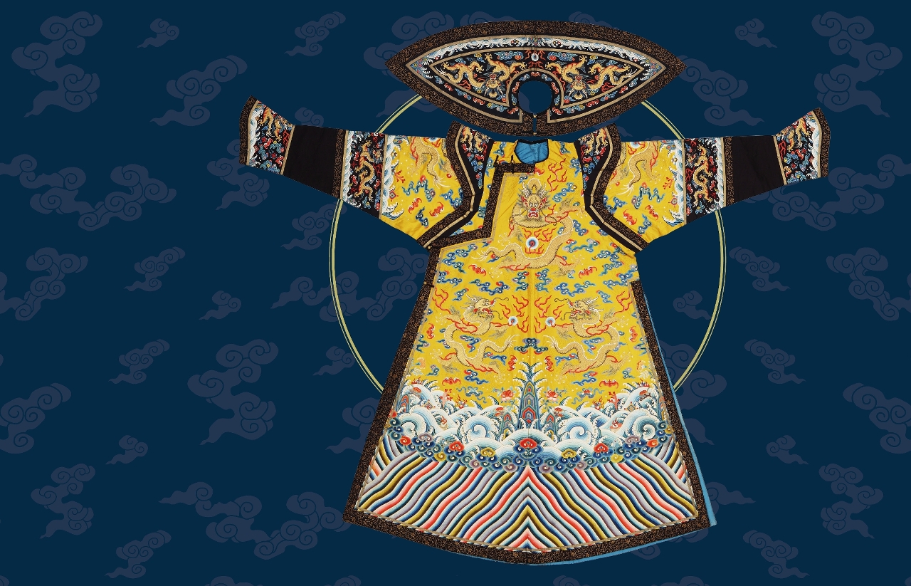 礼服是祭祀、朝会等重大典礼时所穿的服饰,位处清代冠服制度中最高等级规格。礼服设计融合了骑射民族马蹄袖、披领和汉族上衣下裳的服装特色,并包含十二章纹、彩云金龙、海水江崖、蝙蝠、五色等元素。