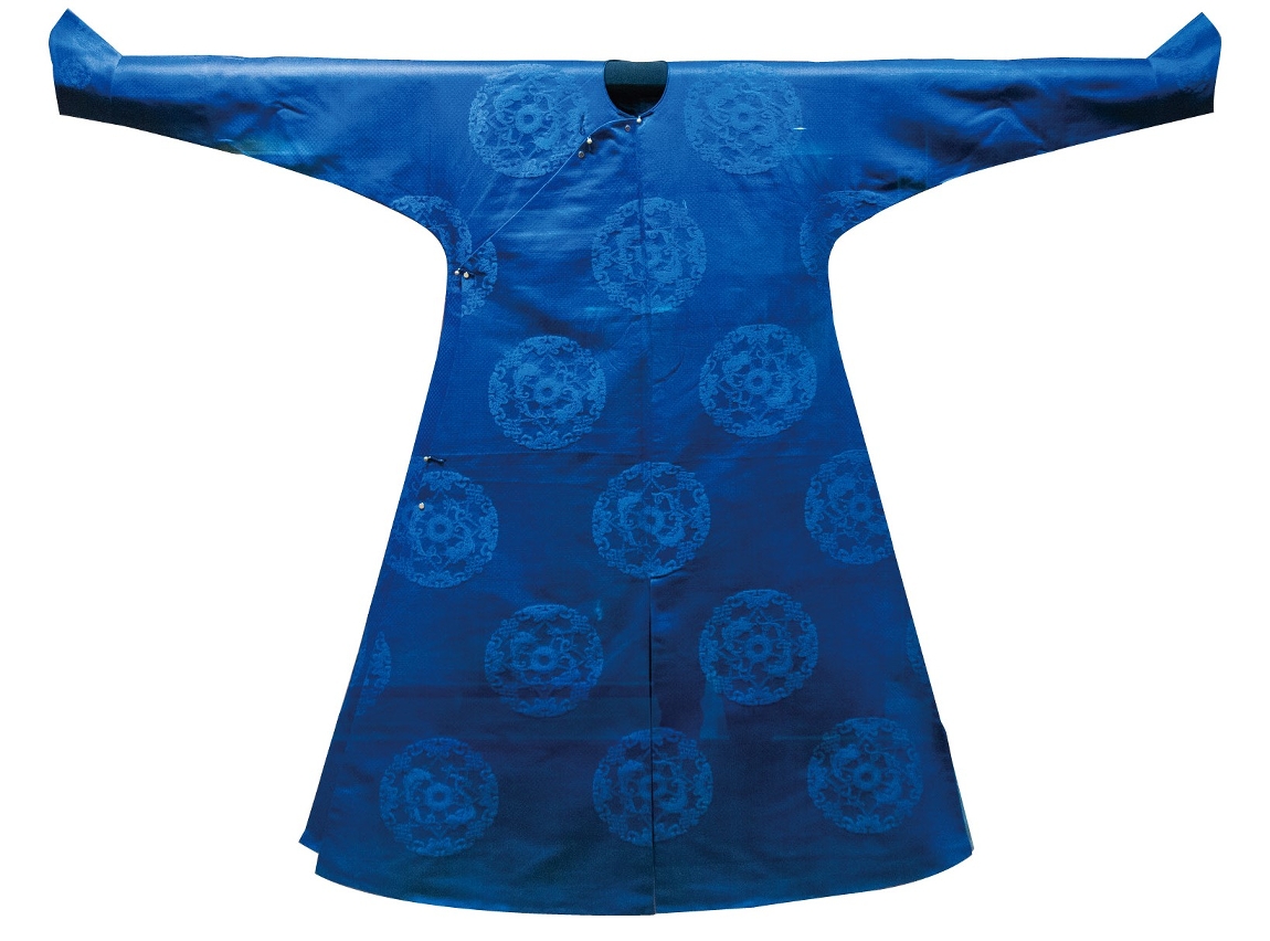 常服袍为清代皇帝常服之一,穿于常服褂之内。常服袍通常使用素织暗花织物制成,不是皇帝平常穿用的便装,主要用于斋戒期及较庄重肃穆的礼仪场合。其式为:圆领,大襟右衽,马蹄袖,左右及前后开裾,直身式袍。缀铜鎏金錾花扣四枚,月白缠枝花纹暗花绫里。(王鹤北)