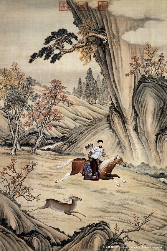 此图表现了乾隆帝弘历在山林间骑马逐鹿的场景,属乾隆时宫廷画家绘制的巡狩题材系列作品之一。画面中乾隆帝气定神闲,胸有成竹,手持一箭已在弦上,彷佛随时都要射向奔跑的鹿。四蹄离地的骏马与鹿,都表现出奔腾的速度感。
