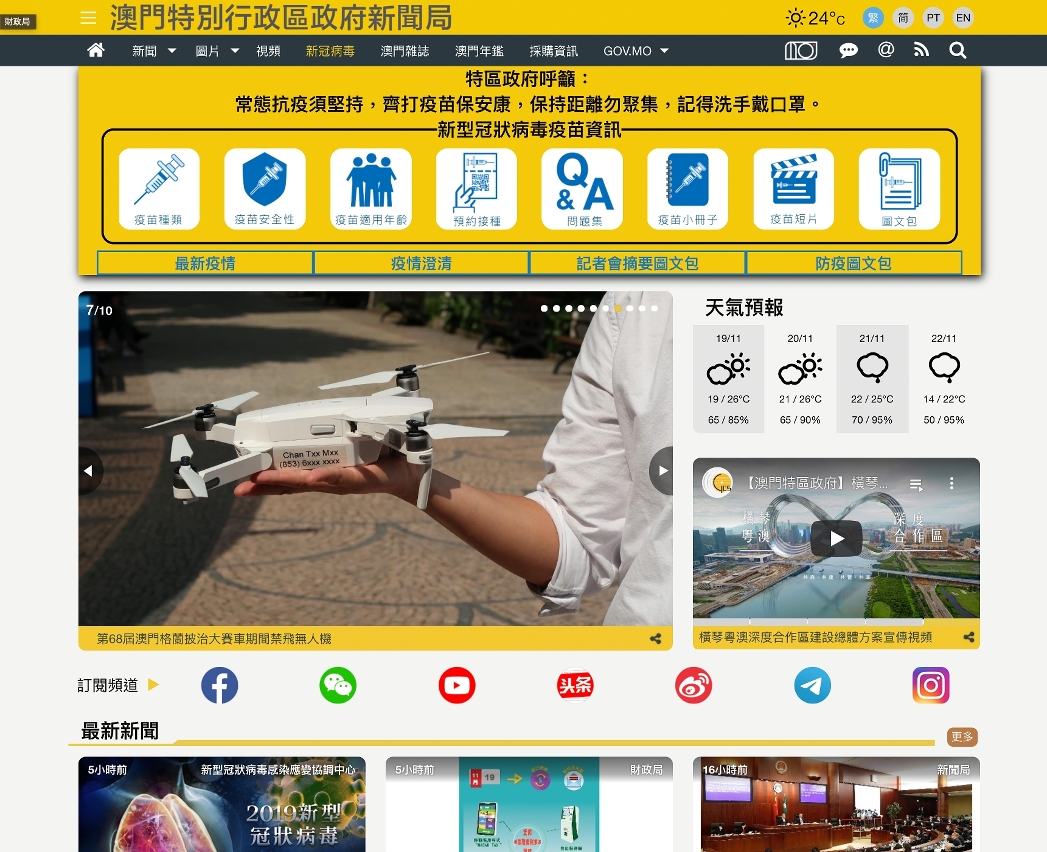 新闻局有系统地在新媒体平台发放讯息,始于2015年起,局方先后开设了微信公众号、Facebook帐号,之后相继加入微博、今日头条号、YouTube等新媒体平台,以不同的形式发放特区政府的权威讯息。2020年2月,为方便海外澳门市民接收特区防疫讯息,还推出了Telegram政府新闻频道。今年2月,开通微信影音号,让特区讯息更快更准地传送到世界不同角落。