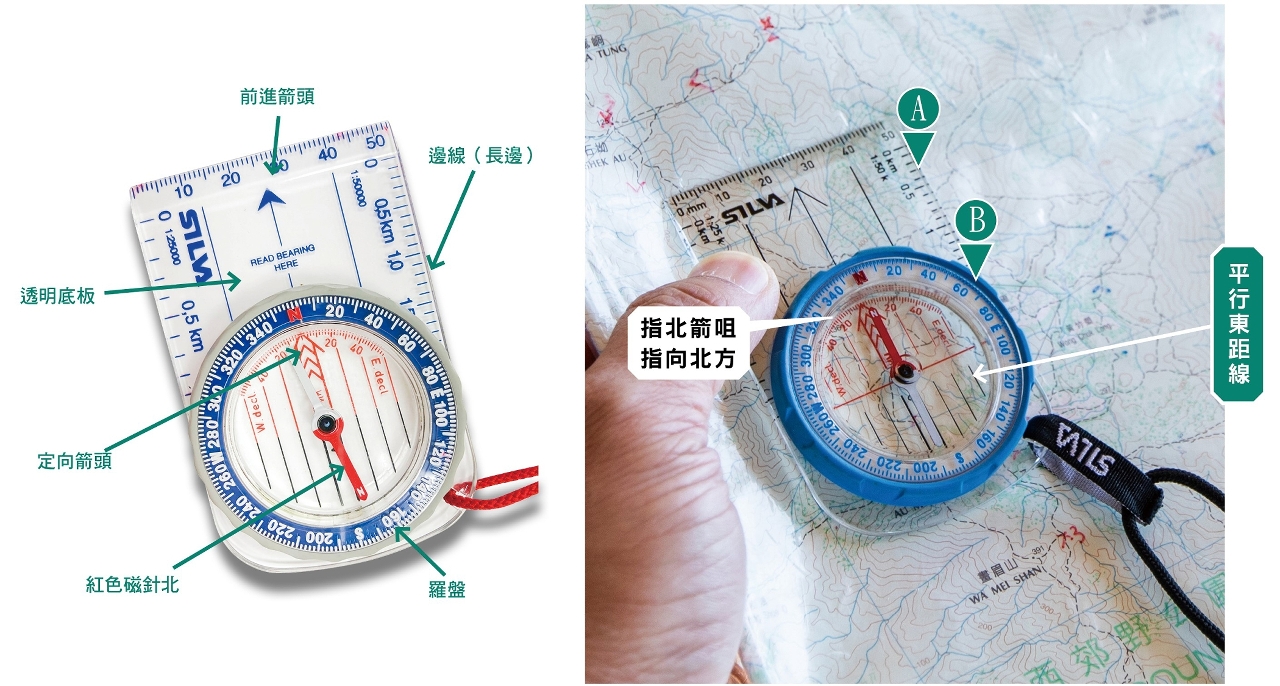 拍:将AB两点连一直线,指南针透明底板的边线(长边)紧贴AB线;