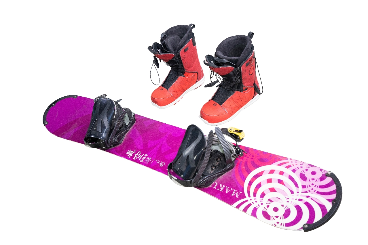 基本器材配备:滑板型雪板、固定器、雪鞋。