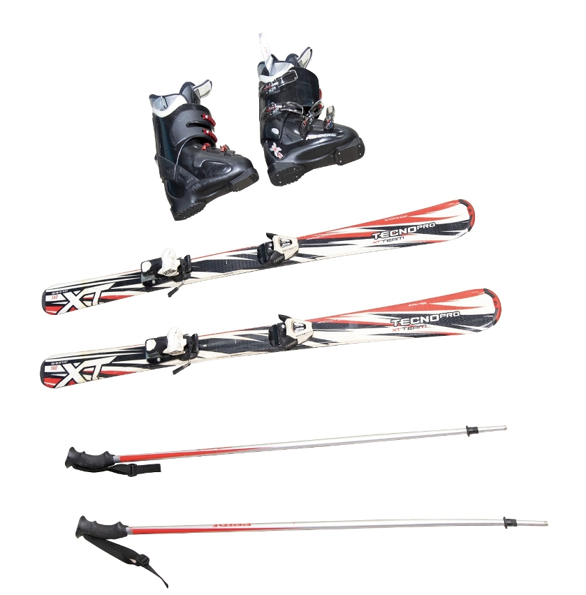 基本器材配备:细长型雪板两枝、固定器、雪鞋、雪杖两枝。