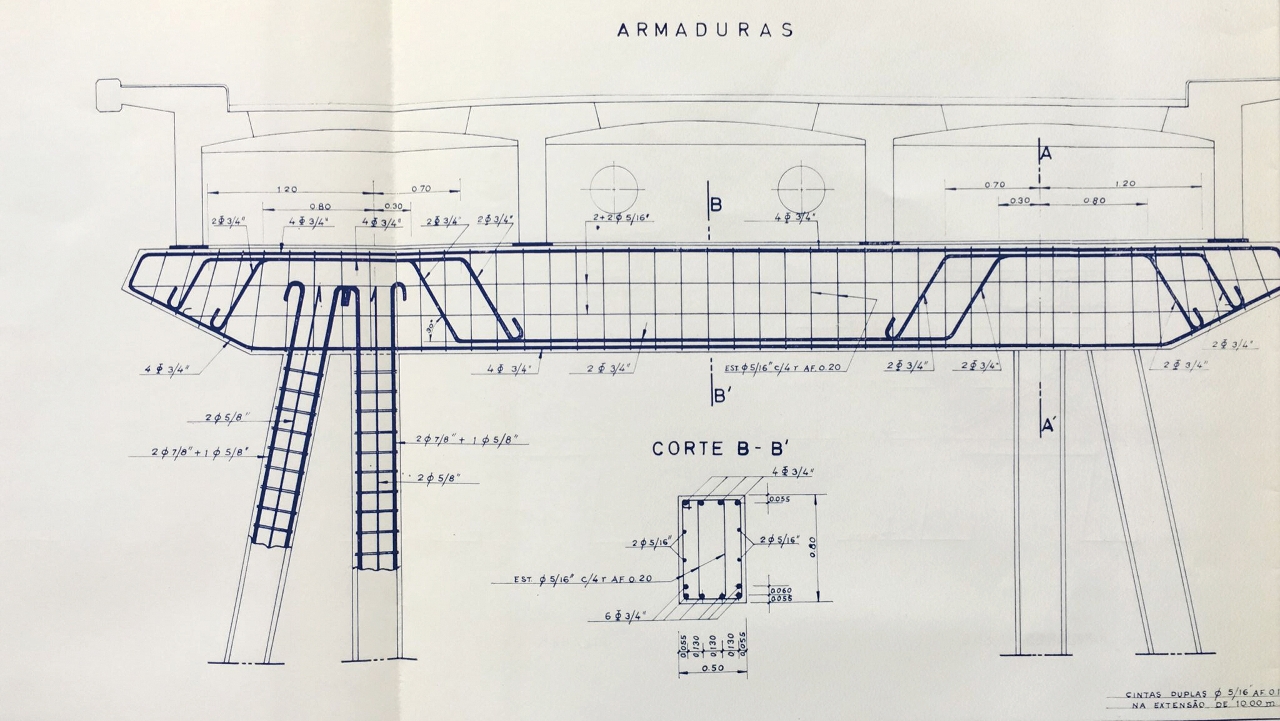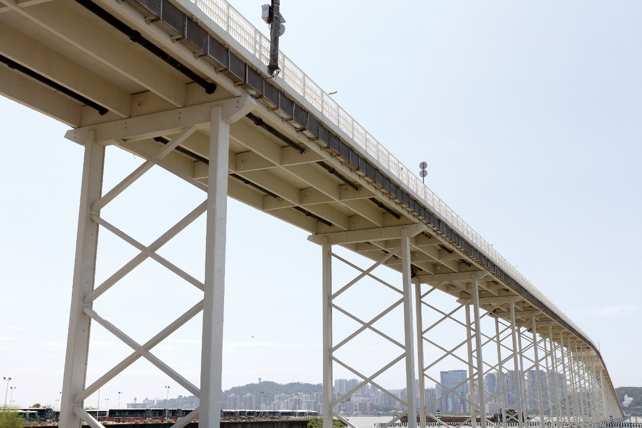 桥面结构的横切面,由四条高度不一的主梁作骨骼,用横梁连结,主梁为预制件,搬运至现场装嵌。中央桥孔的主柱因要求承受更大的压力,较其他柱组巨大。架空引桥构造大致与大桥身相同,但孔距仅18米,较小的船仍可通过。