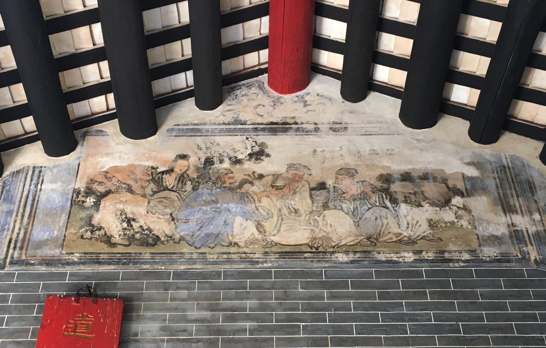 庙宇凹斗门堂前檐下,正面绘有三幅壁画,均有杨瑞石的署名,正中一幅是人物画,画中见七位人士,有年老的、有执毛笔的、有弹琴的,人物神态自然生动,衣纹的勾勒尤见古风,然而由于文字大部份已剥落,加上不适当的维修,已经看不到画题,笔者估计是「七贤图」,两侧是山水画,同样地大部份文字已经模糊。