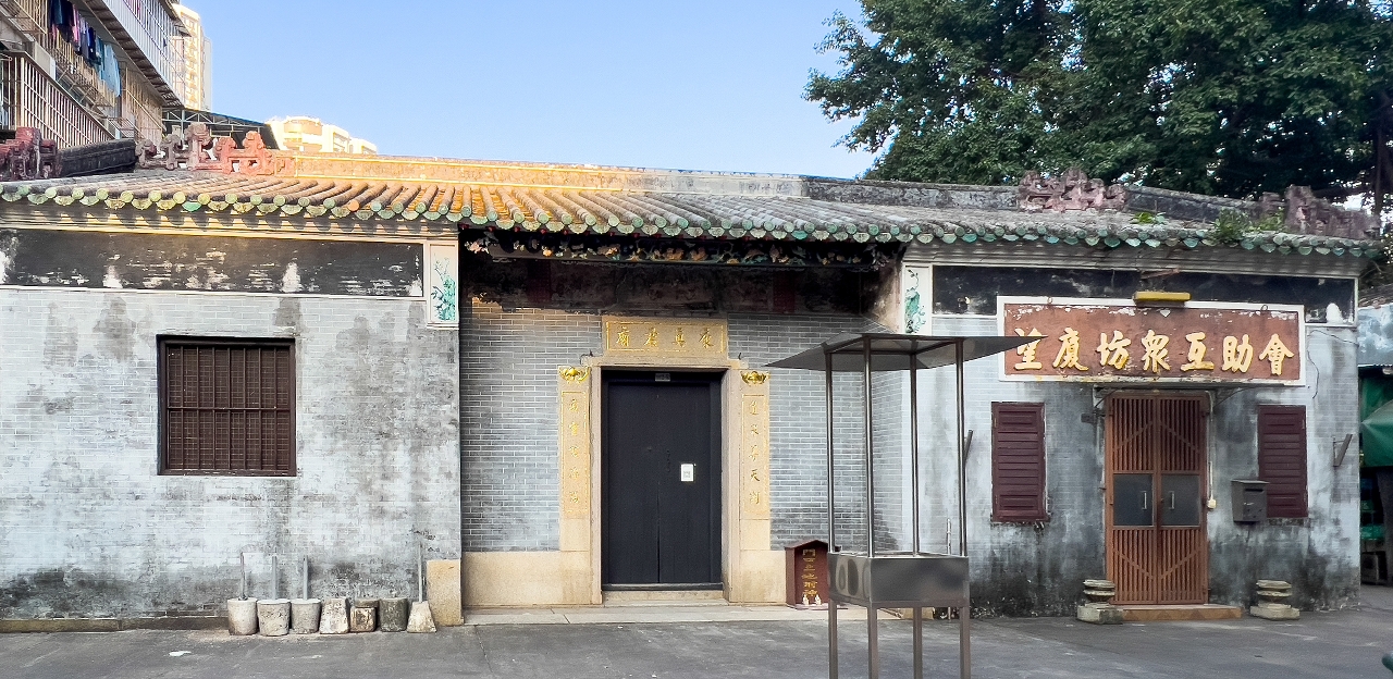 庙宇亦为三路一进的建筑(主路两侧为偏厅,没有水巷分隔),其中东侧偏厅已改作望厦坊众互助会会址。