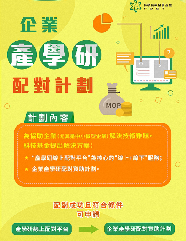 「产学研配对平台」的推出,是科技基金转型发展的重要措施。叶桂林指出,现在澳门的科研成果仍然以学研机构团队为主导,但提升科技创新支撑力,以推动澳门经济适度多元发展,应以科技企业主导,才能实现实际效益最大化,因此,「产学研配对平台」及「产学研配对计划」于2021年下半年应运而生。「产学研中有三个要点,第一就是科技企业提出需求;第二就是供给,学研机构利用现有的科研成果及能力,有意愿去合作解决科技企业技术问题的开发;第三则是风险问题,企业和科研机构如有合作意愿,初次合作难免有风险及信心的问题出现,透过科学技术发展基金『资助+服务』的形式,可以更精准及有效地为学研机构及科技企业提供协助。」直至目前,共有194项科研成果发布在「产学研配对平台」,共成功配对25项。
