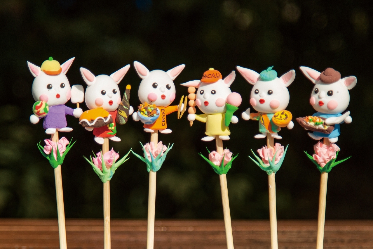 陈斌师傅随后展示了为癸卯兔年创作的兔年系列面粉公仔,每只兔子都穿上了不同颜色的衣服,手捧着澳门特色美食,活泼可爱。还有土生熊猫系列,两只身穿葡萄牙风情装束的熊猫在跳土风舞,圆滚滚的国宝配上葡式装扮,展现出中西文化交融的精粹。「我已经70多岁了,只要能做都会坚持下去,尽绵薄之力,让更多人关注这项传统技艺。我希望大家看到这些面塑系列公仔时,都会想到澳门,让面塑技艺发扬光大。」