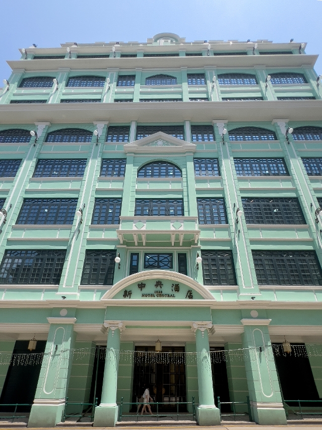 经过结构加固、内部全面装修、外立面修复优化后的新中央酒店今年重新营业,建筑物维持了自1928年落成以来的折衷式样立面(向新马路的立面)。