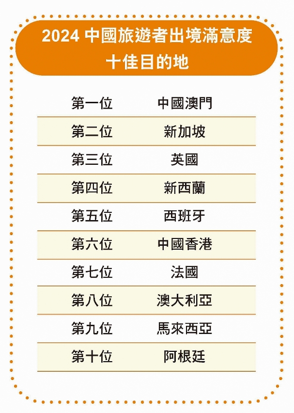 根据中国旅游研究院公布的“2024中国旅游者出境满意度十佳目的地”,澳门首次位列榜首,尤其在“娱乐休闲”及“当地居民态度”方面获得高度评价。澳门获得是次佳绩,是社会各界共同努力的成果,致力为旅客营造良好旅游体验及友好氛围,展现有礼都市形象,巩固“世界旅游休闲中心”的地位,吸引更多世界各地的旅客前来“感受澳门”。