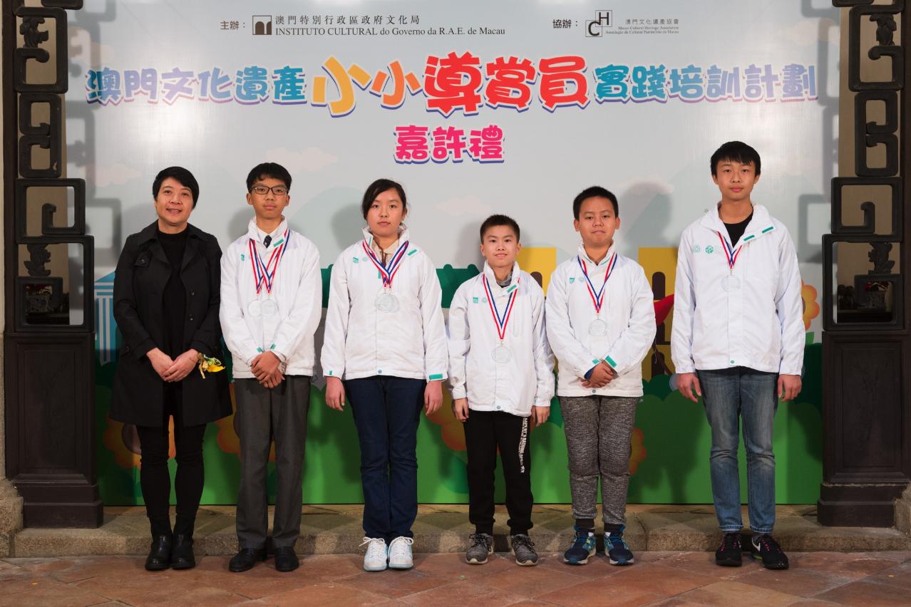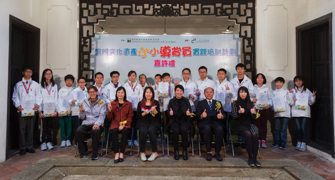 由文化局主办、澳门文化遗产协会协办的“澳门文化遗产小小导赏员实践培训计划2017”已于去年十二月三十一日顺利完成,并于日前(一月六日)在郑家大屋举行“澳门文化遗产小小导赏员实践培训计划2017”嘉许礼,以表扬参与的学员。一众嘉宾、学员及家长共同见证是次计划的成果,现场气氛热烈,济济一堂。出席嘉宾包括文化局代副局长梁惠敏、教育暨青年局代表学前暨小学教育处代处长吴美琪、大三巴哪咤庙值理会会长叶达、澳门培道中学校长李宝田、澳门文化遗产协会项目主任李雪芬及资深历史学者陈树荣。