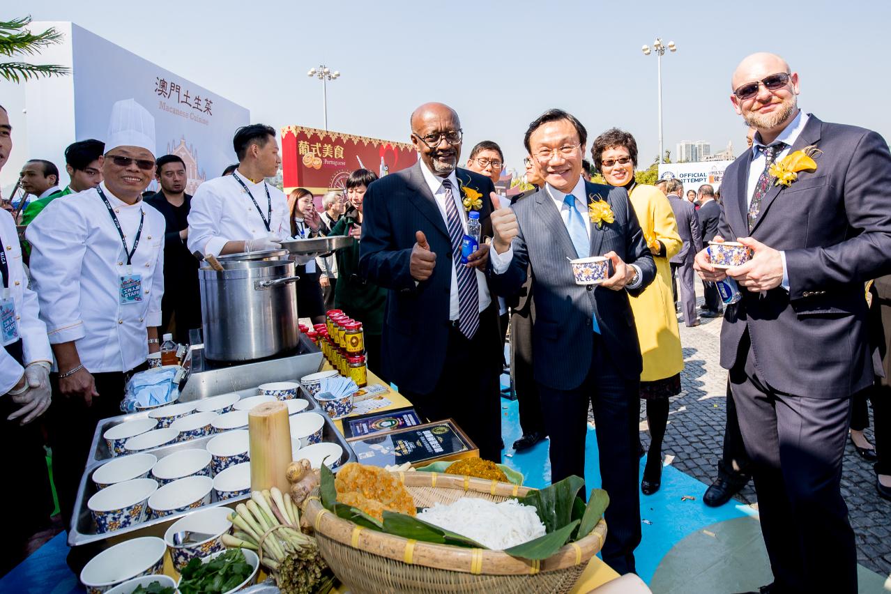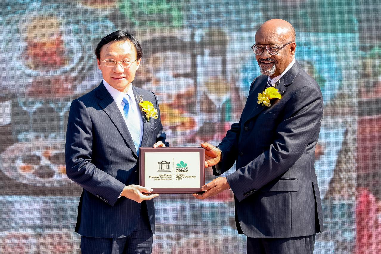 同场进行了澳门获评为联合国教科文组织-"创意城市美食之都"授牌仪式,由联合国教科文组织副总干事格塔丘•恩吉达颁授,社会文化司司长谭俊荣接受。
