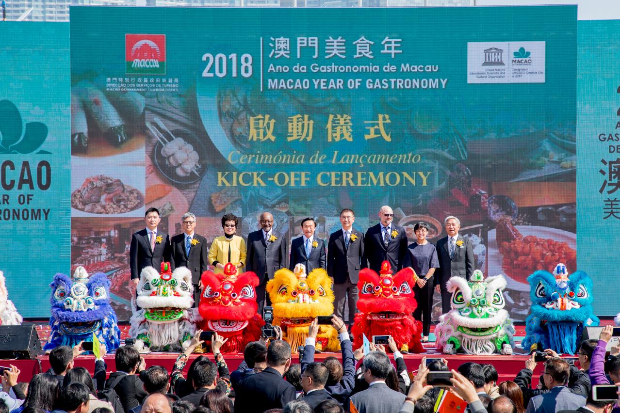 "2018澳门美食年"启动仪式在本月17日于西湾湖广场举行,主礼嘉宾有澳门特别行政区政府社会文化司司长及中国澳门申报联合国教科文组织创意城市网络工作委员会主席谭俊荣、联合国教科文组织副总干事格塔丘•恩吉达、中央人民政府驻澳门特别行政区联络办公室副主任姚坚、中华人民共和国外交部驻澳门特别行政区特派员公署副特派员王冬、瑞典厄斯特松德市副市长及联合国教科文组织创意城市网络-美食之都城市群协调员Anders Edvinsson (译名:安德斯 ・埃德文森)、澳门特别行政区政府社会文化司司长办公室主任叶炳权、澳门特别行政区政府旅游局局长文绮华、中国联合国教科文组织全国委员会秘书处科学文化处处长申玉彪及澳门餐饮业联合商会会长陈泽武。