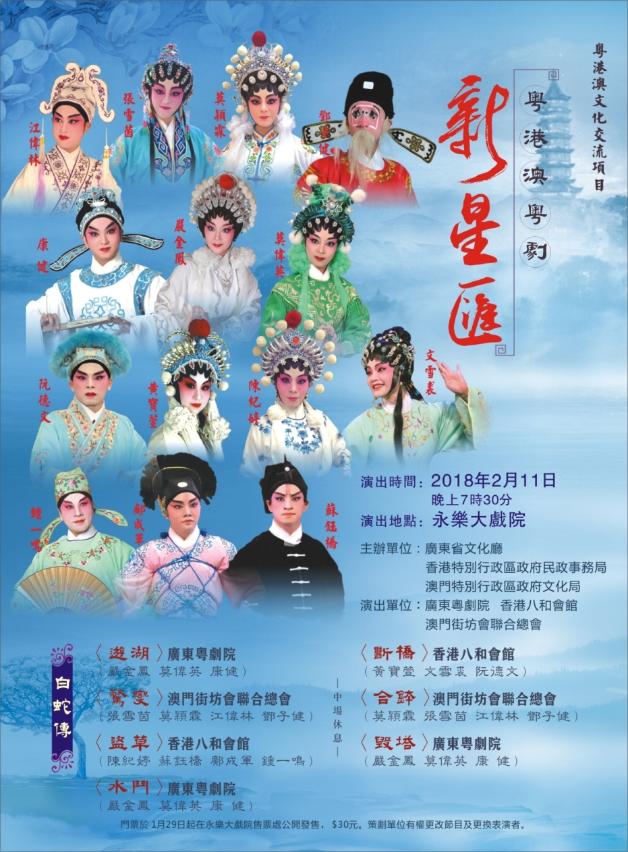 二零一八年度粤港澳文化合作项目 “粤港澳粤剧新星汇”,将由粤港澳三地青年粤剧新秀携手合作,共同演绎长剧《白蛇传》,于一月至二月期间分别在广州、香港和澳门三地巡演。澳门场次演出将于二月十一日晚上七时三十分假永乐大戏院公演,欢迎市民购票欣赏。