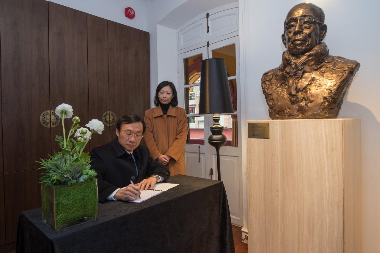 文化局今天起在饶宗頣学艺馆设立吊唁册供公众悼念一代国学大师。上午九时,社会文化司司长谭俊荣到学艺馆,他在吊唁册上写道:“国学大师饶宗颐先生治学勤勉,博学,深深影响后世文人学子。愿饶公精神不朽!"谭俊荣又与在场的文化局局长穆欣欣等参观馆内陈设,回顾学艺馆开幕时的盛况,共同缅怀饶宗颐先生的事迹与贡献。