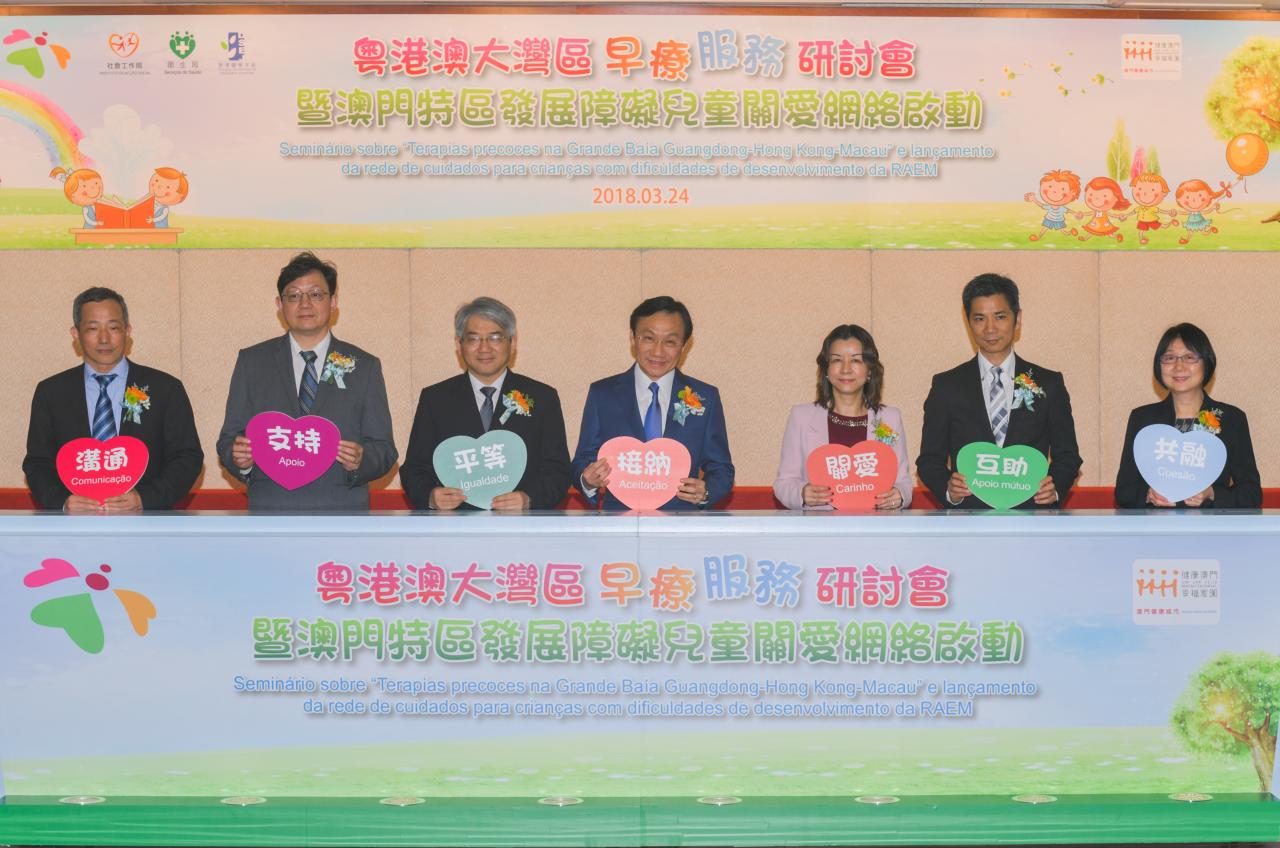 澳门特区政府十分关注发展障碍儿童的早疗服务,一直协同民间组织为有特殊需要的儿童及其家庭提供支援。为统筹及持续促进本澳早疗服务发展,社会文化司辖下卫生局、教育暨青年局及社会工作局合办的“粤港澳大湾区早疗服务研讨会暨澳门特区发展障碍儿童关爱网络启动”今日(3月24日)在黑沙环卫生中心举行,出席嘉宾包括:社会文化司谭俊荣司长、社会文化司司长办公室叶炳权主任、卫生局李展润局长、教育暨青年局老柏生局长、社会工作局黄艳梅局长等政府人员、早疗服务机构的代表以及家长等约300人。