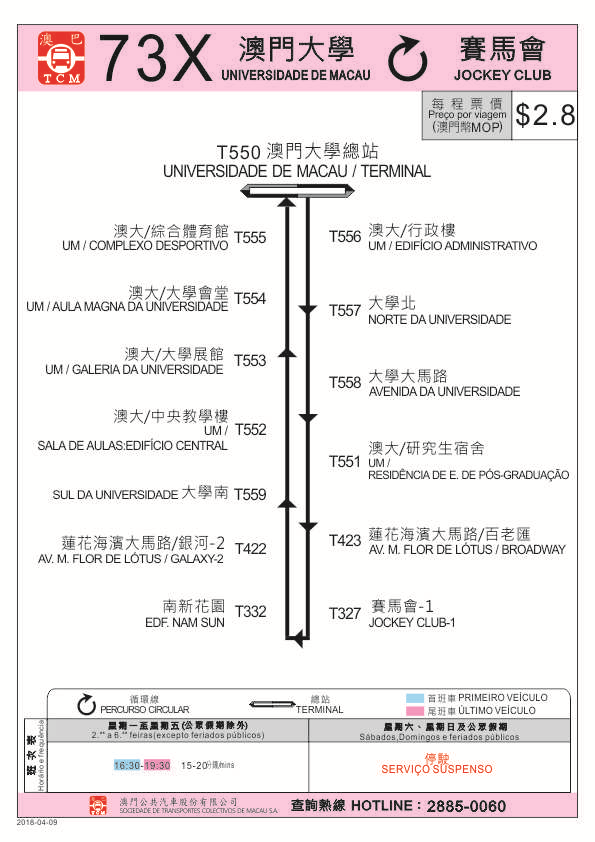 为疏导澳门大学校区下午尖峰时段的出行需求,交通事务局由4月9日(周一)起开通73X巴士路线,连接澳门大学至氹仔赛马会,服务时间为周一至周五每日下午4时30分至7时30分,班次频率则为15至20分钟。呼吁公众留意。