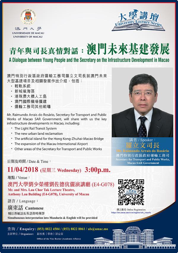 澳门大学及运输工务司将于4月11日(星期三)举行“大学讲坛 - 青年与司长真情对话”,运输工务司司长罗立文将以《澳门未来基建发展》为题,与大学青年交流互动。