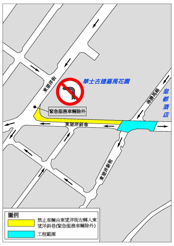 因东望洋斜巷与得胜马路交界铺设水管、电缆及管道,4月21日(周六)起,除紧急服务车辆,禁止车辆由东望洋街左转入东望洋斜巷,而东望洋斜巷近东望洋新街及近富铭大厦之摩托车、汽车咪表泊车位及上落客货位暂停使用,工期20日。