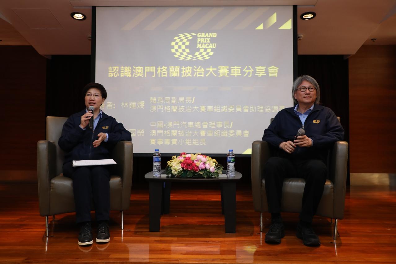 是次分享会活动的主讲嘉宾包括:澳门格兰披治大赛车组织委员会助理协调员林莲娇及秘书长李诗灵、赛事专责小组组长钟国荣及成员李志良。